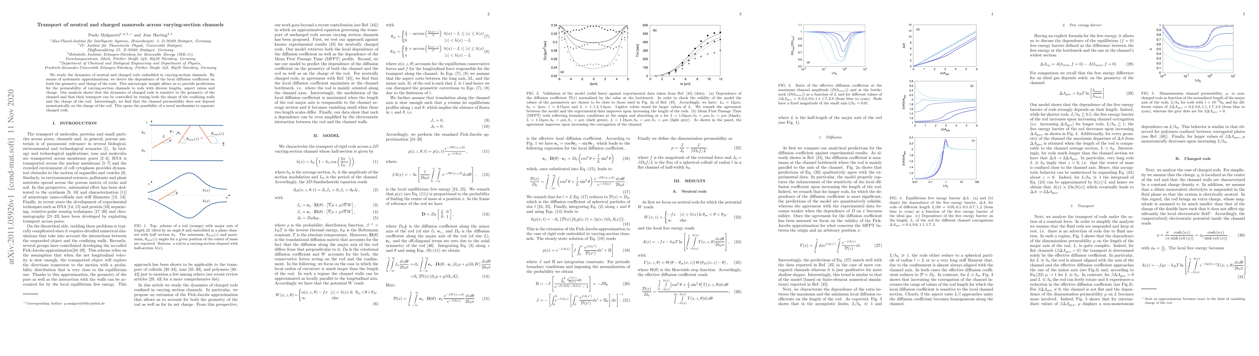 We study the dynamics of neutral and charged rods embedded in varying-section channels. By means of systematic approximations, we derive the dependence of the local diffusion coefficient on both the geometry and charge of the rods. This microscopic insight allows us to provide predictions for the permeability of varying-section channels to rods with diverse lengths, aspect ratios and charge. Our analysis shows that the dynamics of charged rods is sensitive to the geometry of the channel and that their transport can be controlled by tuning both the shape of the confining walls and the charge of the rod. Interestingly, we find that the channel permeability does not depend monotonically on the charge of the rod. This opens the possibility of a novel mechanism to separate charged rods.