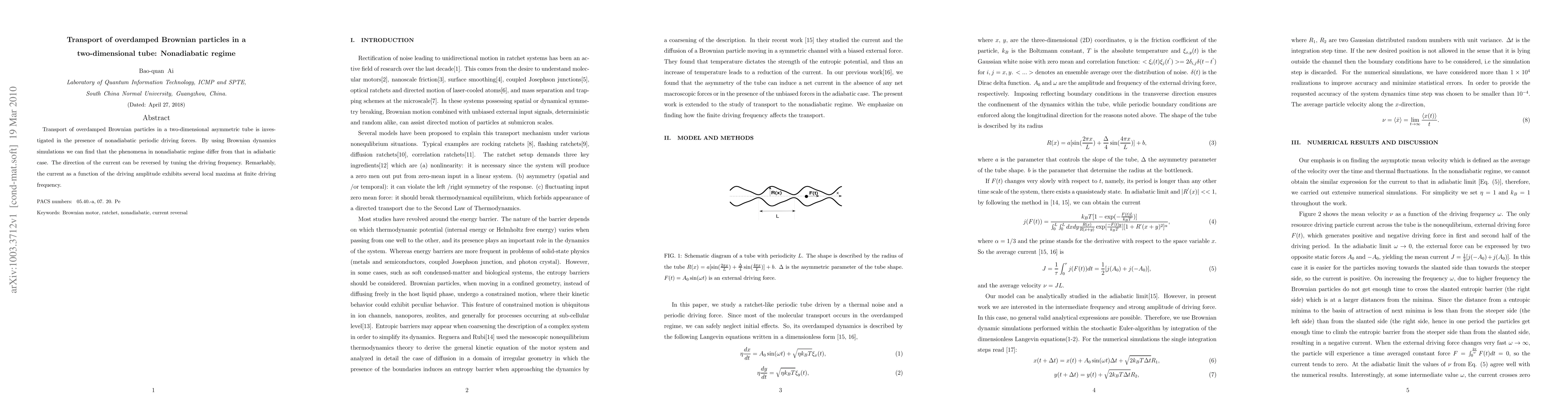 This study investigates the transport of overdamped Brownian particles in a two-dimensional asymmetric tube under nonadiabatic periodic driving forces, revealing that the current direction can reverse with frequency tuning and displays multiple local maxima in current-amplitude relationships.