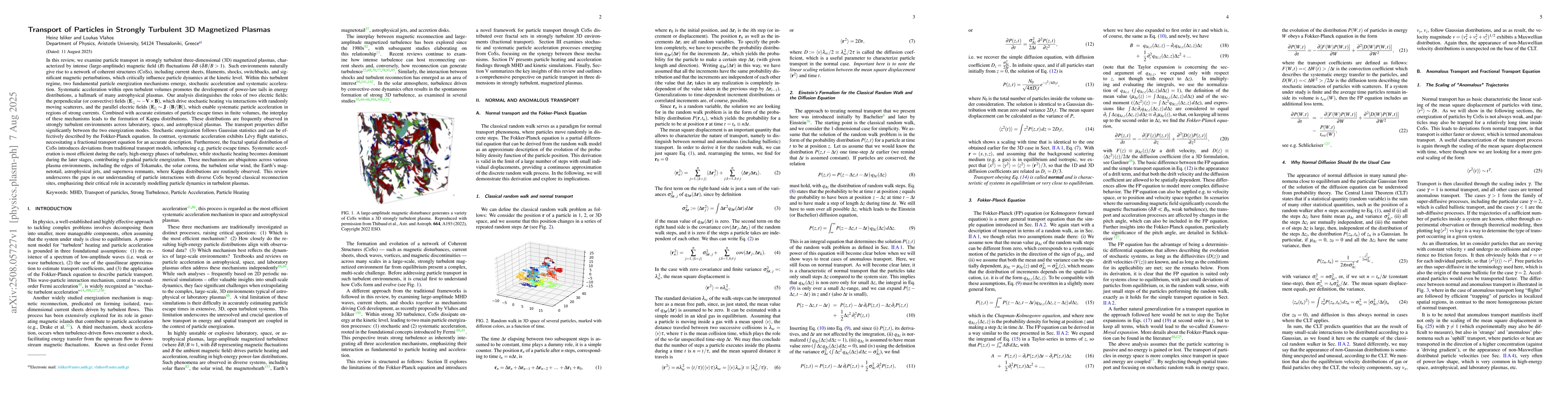 In this review, we examine particle transport in strongly turbulent three-dimensional (3D) magnetized plasmas, characterized by intense (large-amplitude) magnetic field fluctuations. Such environments naturally give rise to a network of coherent structures (CoSs), including current sheets, filaments, shocks, switchbacks, and significant magnetic perturbations, which critically influence particle dynamics at the kinetic level. Within this turbulent regime, two fundamental particle energization mechanisms emerge, stochastic acceleration and systematic acceleration. Systematic acceleration within open turbulent volumes promotes the development of power-law tails in energy distributions. Our analysis distinguishes the roles of two electric fields: the perpendicular (or convective) fields, which drive stochastic heating via interactions with randomly moving scatterers, and the parallel electric fields, which enable systematic particle acceleration in regions of strong currents. Combined with accurate estimates of particle escape times in finite volumes, the interplay of these mechanisms leads to the formation of Kappa distributions. The transport properties differ significantly between the two energization modes. Stochastic energization follows Gaussian statistics and can be effectively described by the Fokker-Planck equation. In contrast, systematic acceleration exhibits Levy flight statistics, necessitating a fractional transport equation for an accurate description. Furthermore, the fractal spatial distribution of CoSs introduces deviations from traditional transport models, influencing e.g. particle escape times. Systematic acceleration is most efficient during the early, high-energy phases of turbulence, while stochastic heating becomes dominant during the later stages, contributing to gradual particle energization.
