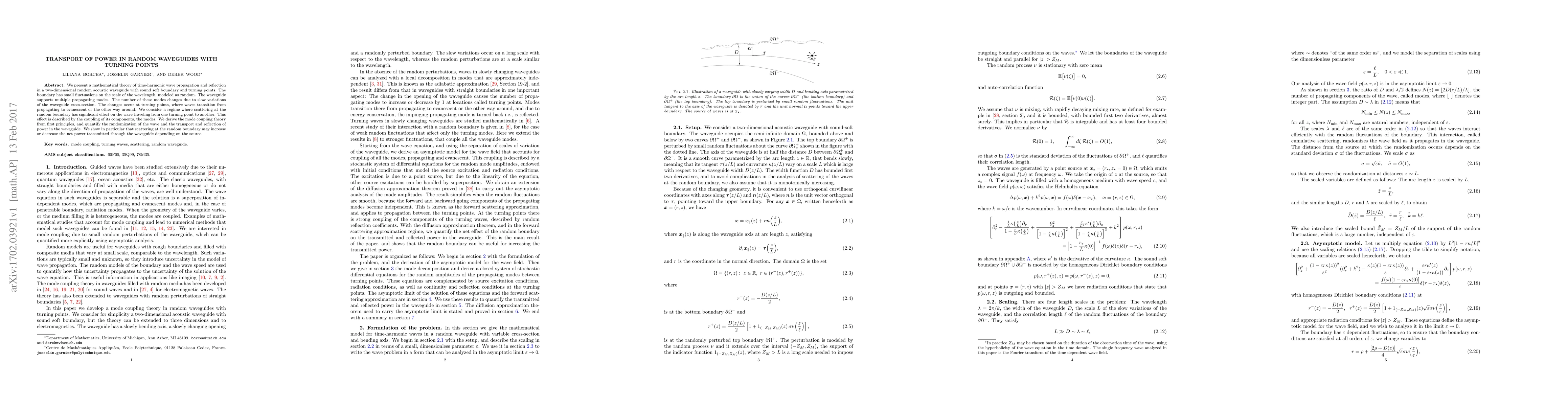 This paper develops a mathematical theory for wave propagation in random acoustic waveguides with turning points, showing how scattering affects power transport and reflection. It derives a mode coupling theory to quantify the randomization and power dynamics, revealing that random boundary scattering can either enhance or reduce net power transmission.