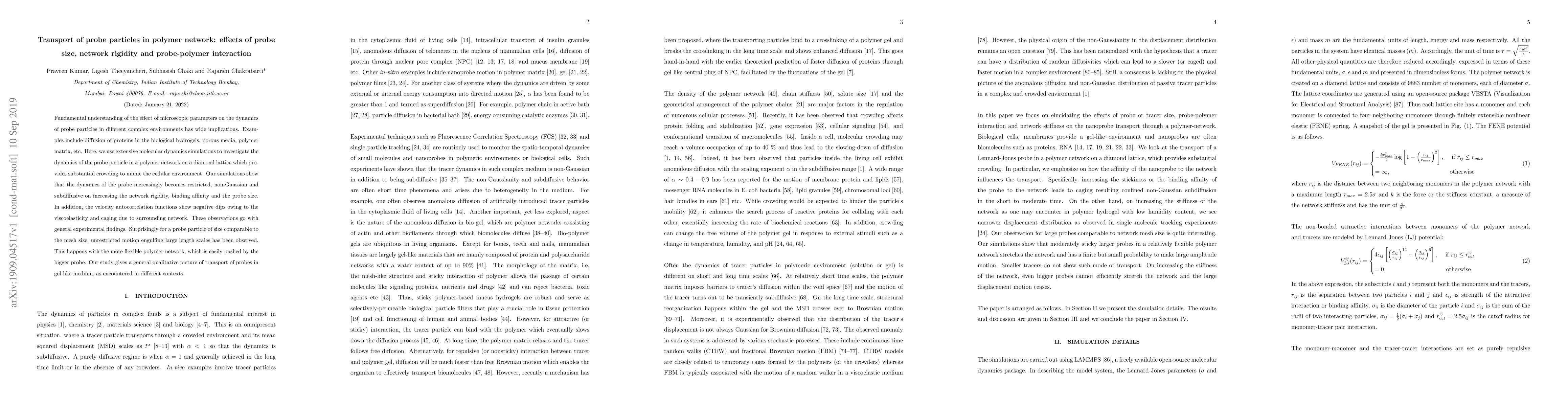 This research uses molecular dynamics simulations to explore how probe particle size, polymer network rigidity, and probe-polymer interactions affect particle dynamics in a crowded polymer network. The study finds that increased network rigidity, stronger binding affinity, and larger probe size lead to restricted, non-Gaussian, and subdiffusive probe dynamics, with notable exceptions for probes comparable to mesh size in more flexible networks.