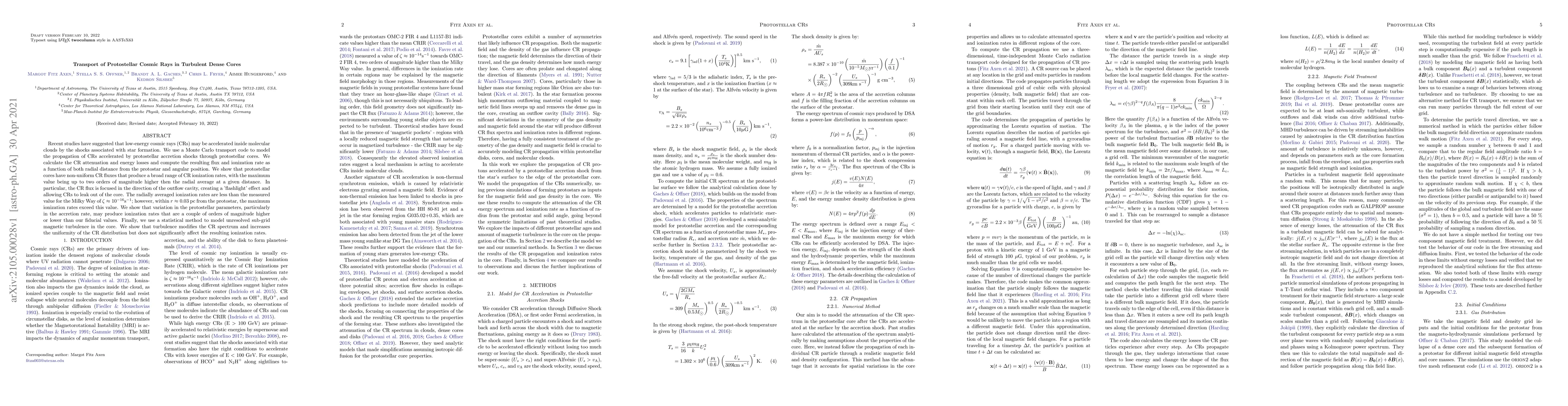 This paper models the transport of cosmic rays (CRs) in turbulent dense protostellar cores, finding that CR fluxes are non-uniform and focused towards outflow cavities, leading to higher ionization rates near the protostar. Turbulence enhances CR distribution uniformity but minimally impacts ionization rates.