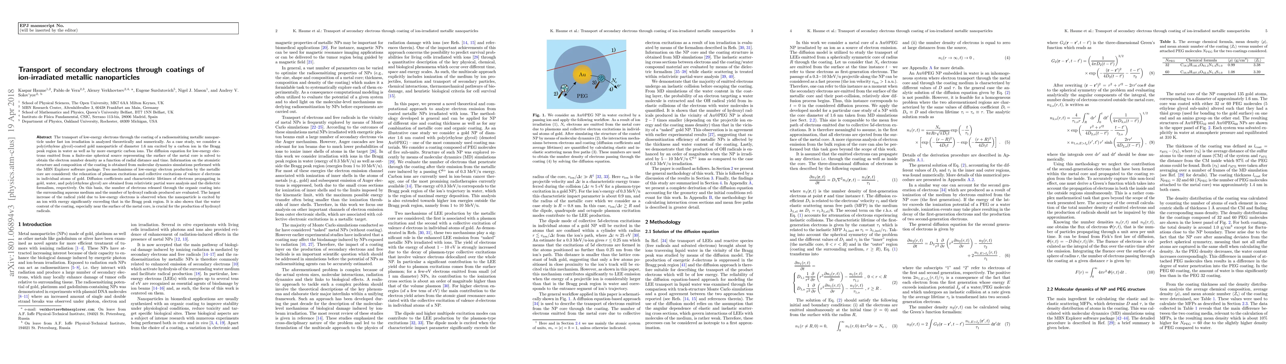 This paper theoretically and numerically analyzes the transport of secondary electrons through a poly(ethylene glycol) coating on a gold nanoparticle under ion irradiation. It finds that the largest increase in hydroxyl radical production occurs when the nanoparticle is excited by high-energy ions, emphasizing the importance of water content near the metal core.