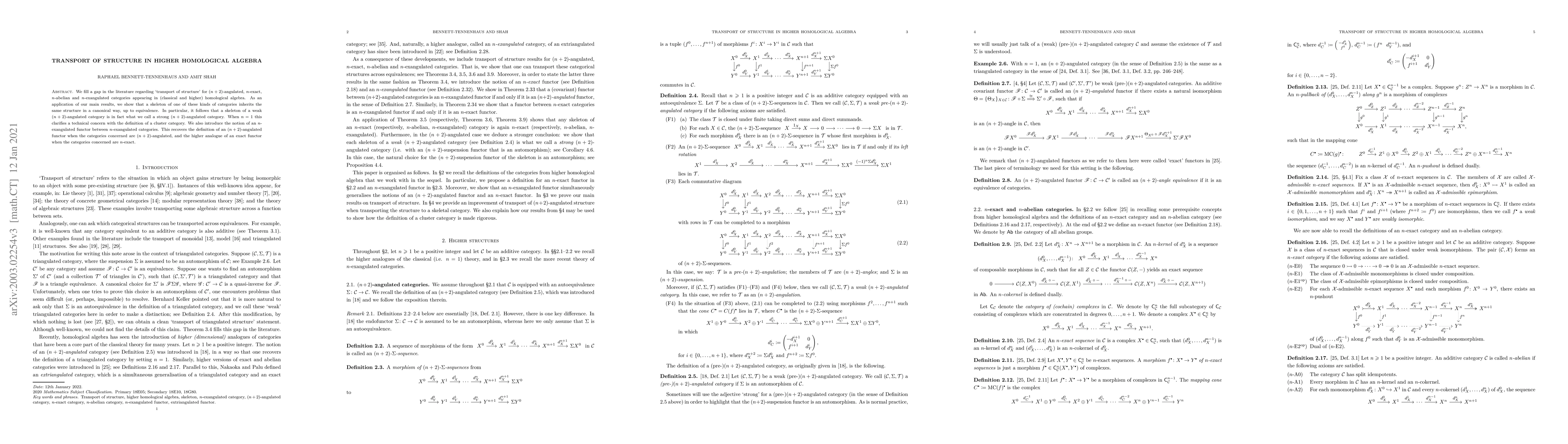 We fill a gap in the literature regarding `transport of structure' for (n+2)-angulated, n-exact, n-abelian and n-exangulated categories appearing in (classical and higher) homological algebra. As an application of our main results, we show that a skeleton of one of these kinds of categories inherits the same structure in a canonical way, up to equivalence. In particular, it follows that a skeleton of a weak (n+2)-angulated category is in fact what we call a strong (n+2)-angulated category. When n=1 this clarifies a technical concern with the definition of a cluster category. We also introduce the notion of an n-exangulated functor between n-exangulated categories. This recovers the definition of an (n+2)-angulated functor when the categories concerned are (n+2)-angulated, and the higher analogue of an exact functor when the categories concerned are n-exact.
