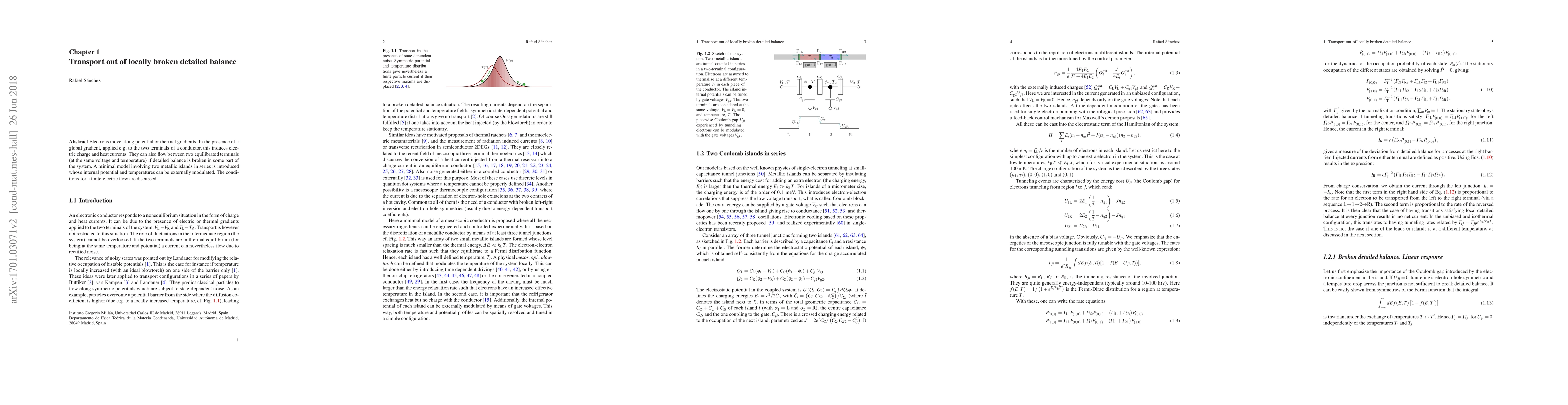 This paper investigates electron transport through a minimal model of two metallic islands in series, where local disruptions to detailed balance can induce electric currents even without a global gradient, exploring the conditions enabling such transport.