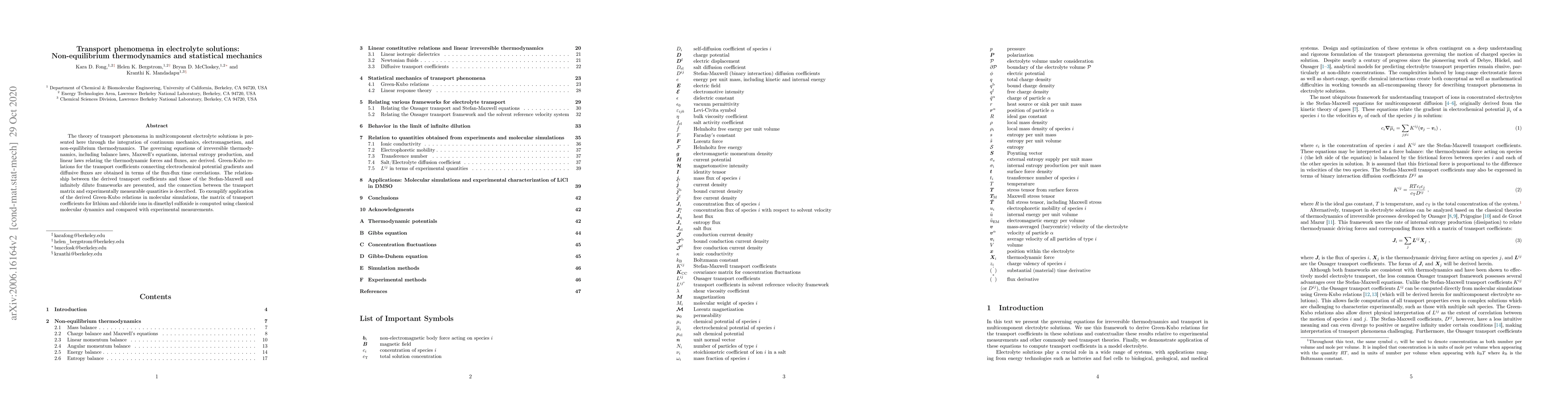 This paper integrates continuum mechanics, electromagnetism, and non-equilibrium thermodynamics to derive governing equations for transport phenomena in multicomponent electrolyte solutions. It computes Green-Kubo relations for transport coefficients and compares them to experimental measurements in molecular simulations of lithium and chloride ions in dimethyl sulfoxide.