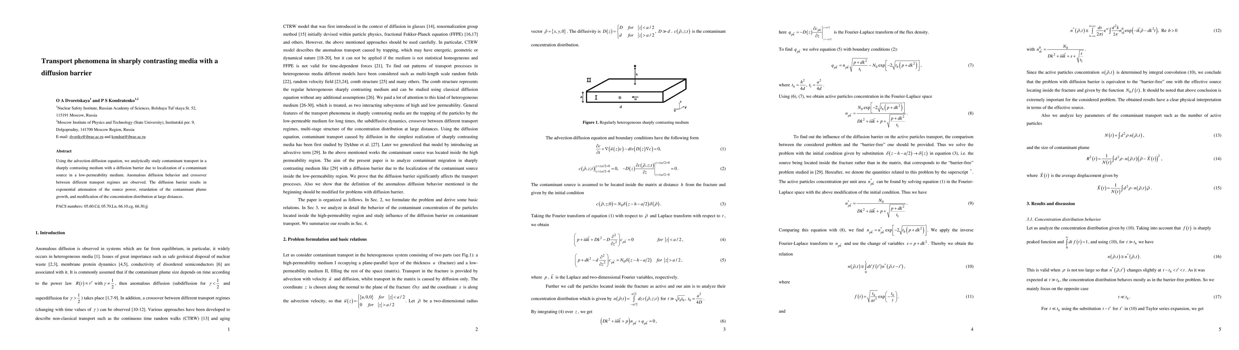 This paper analytically studies contaminant transport in sharply contrasting media with a diffusion barrier, revealing anomalous diffusion and regime crossovers. The diffusion barrier causes exponential attenuation of source power, slows plume growth, and alters concentration distribution over large distances.