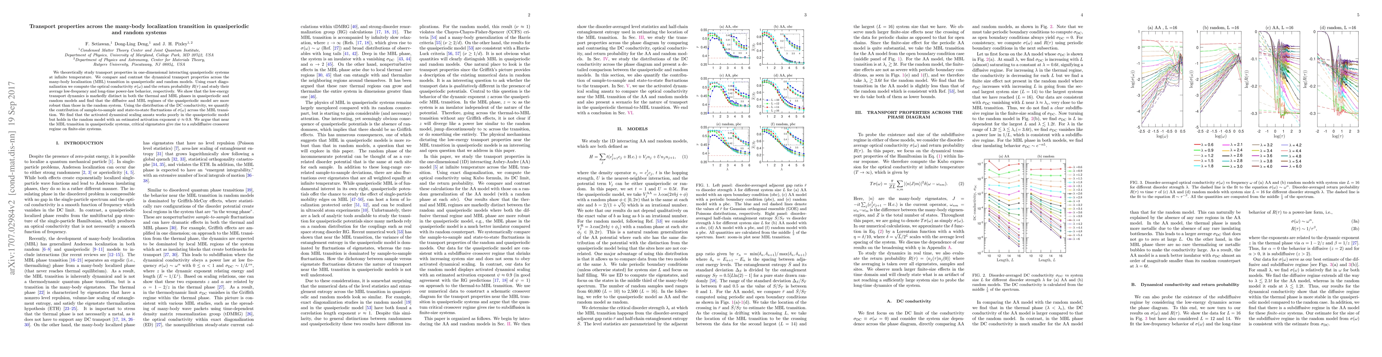 This paper explores transport properties in one-dimensional interacting quasiperiodic systems at infinite temperature, comparing them with random systems across the many-body localization transition. It finds that quasiperiodic systems exhibit more robust diffusive and MBL regimes and a subdiffusive crossover near the transition, contrasting with the activated dynamical scaling observed in random systems.