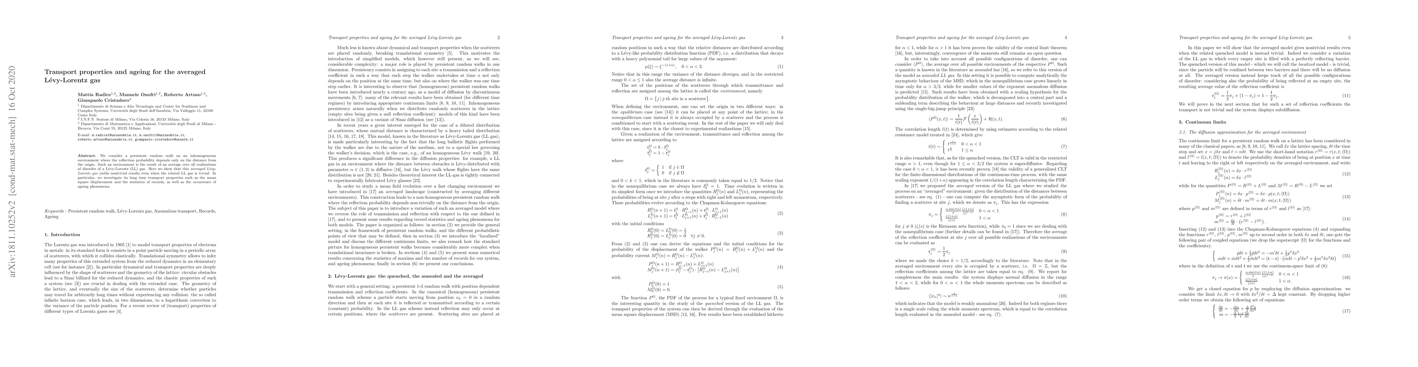We consider a persistent random walk on an inhomogeneous environment where the reflection probability depends only on the distance from the origin. Such an environment is the result of an average over all realizations of disorder of a L\'evy-Lorentz (LL) gas. Here we show that this averaged L\'evy-Lorentz gas yields nontrivial results even when the related LL gas is trivial. In particular, we investigate its long time transport properties such as the mean square displacement and the statistics of records, as well as the occurrence of ageing phenomena.