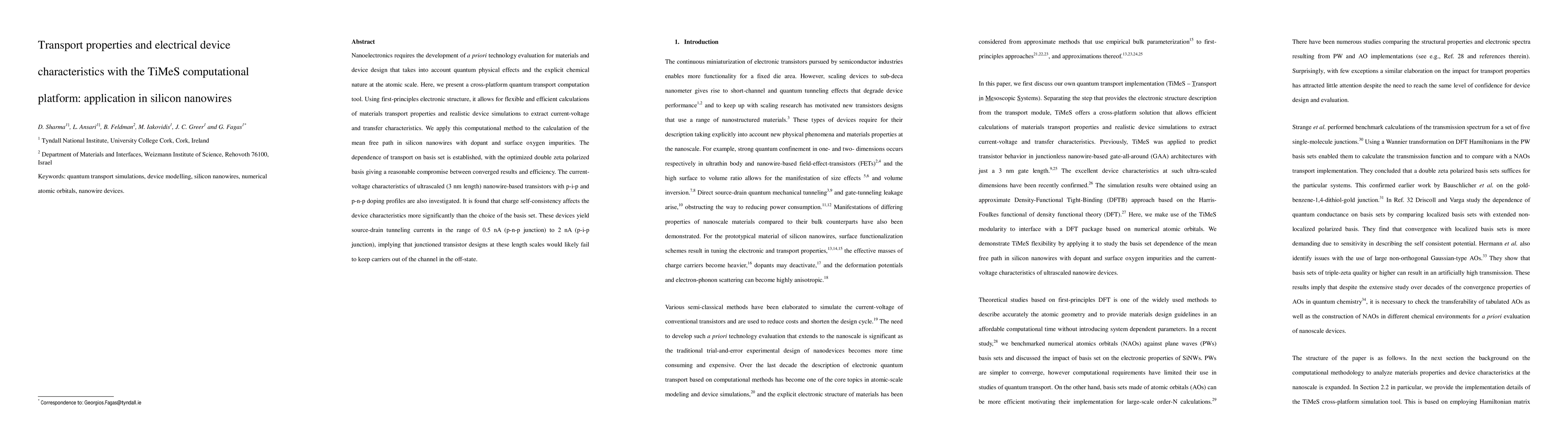 Nanoelectronics requires the development of a priori technology evaluation for materials and device design that takes into account quantum physical effects and the explicit chemical nature at the atomic scale. Here, we present a cross-platform quantum transport computation tool. Using first-principles electronic structure, it allows for flexible and efficient calculations of materials transport properties and realistic device simulations to extract current-voltage and transfer characteristics. We apply this computational method to the calculation of the mean free path in silicon nanowires with dopant and surface oxygen impurities. The dependence of transport on basis set is established, with the optimized double zeta polarized basis giving a reasonable compromise between converged results and efficiency. The current-voltage characteristics of ultrascaled (3 nm length) nanowire-based transistors with p-i-p and p-n-p doping profiles are also investigated. It is found that charge self-consistency affects the device characteristics more significantly than the choice of the basis set. These devices yield source-drain tunneling currents in the range of 0.5 nA (p-n-p junction) to 2 nA (p-i-p junction), implying that junctioned transistor designs at these length scales would likely fail to keep carriers out of the channel in the off-state.