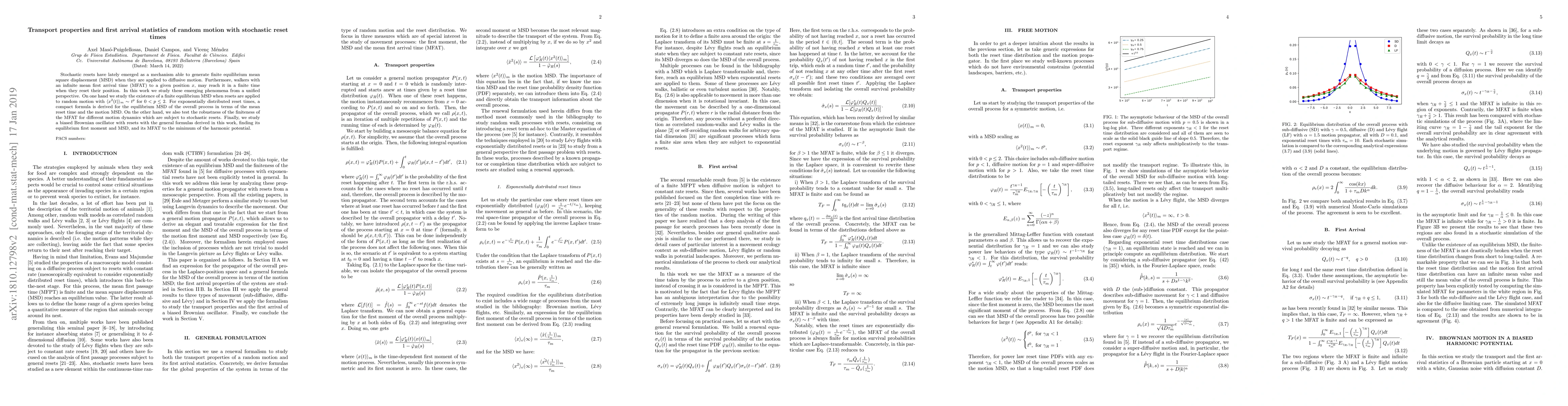 This paper investigates the transport properties and first arrival statistics of random searches with stochastic reset times, deriving a formula for the equilibrium mean square displacement under exponential resets and examining the finiteness of the mean first arrival time for various motion dynamics subject to resets. It also applies these findings to a biased Brownian oscillator with resets.