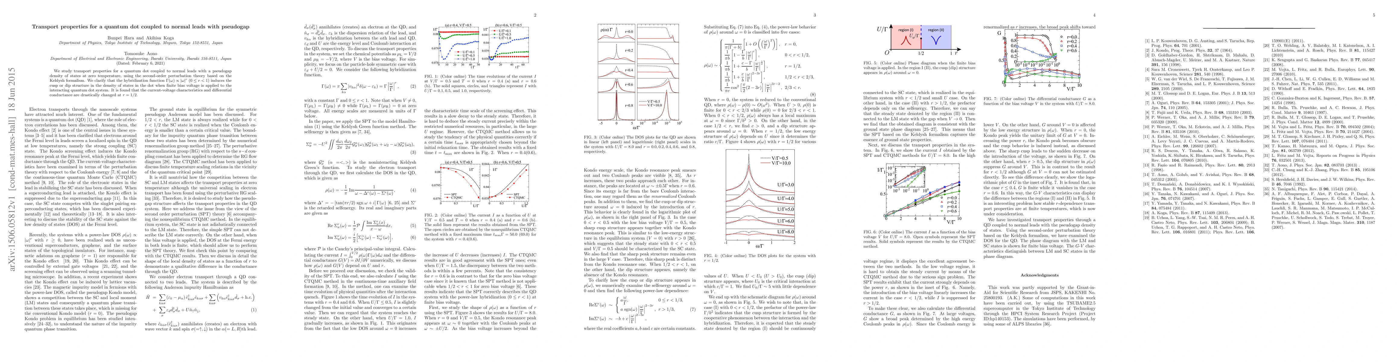 This paper investigates the transport properties of a quantum dot connected to normal leads featuring a pseudogap, employing second-order perturbation theory within the Keldysh formalism. It reveals that the hybridization function $\Gamma(\omega)\propto |\omega|^r$ (where $0 \le r < 1$) causes cusp or dip structures in the dot's density of states, significantly altering current-voltage characteristics and differential conductance at $r=1/2$.