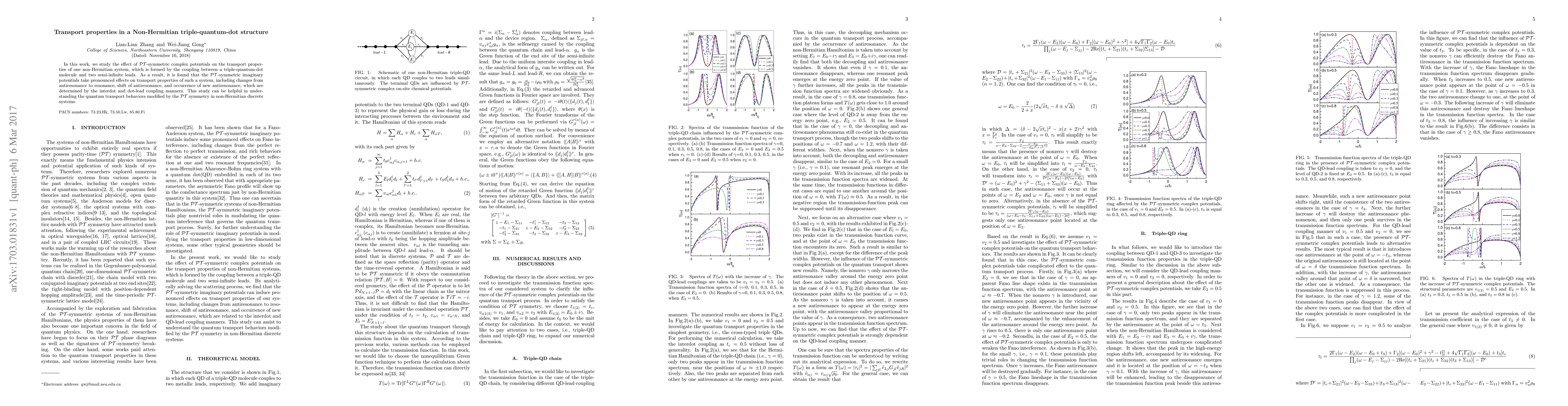 Researchers studied how non-Hermitian systems with PT-symmetric potentials affect quantum transport in a triple-quantum-dot molecule connected to leads. They found significant changes in transport properties, including shifts and new resonances, which depend on the coupling between dots and leads.