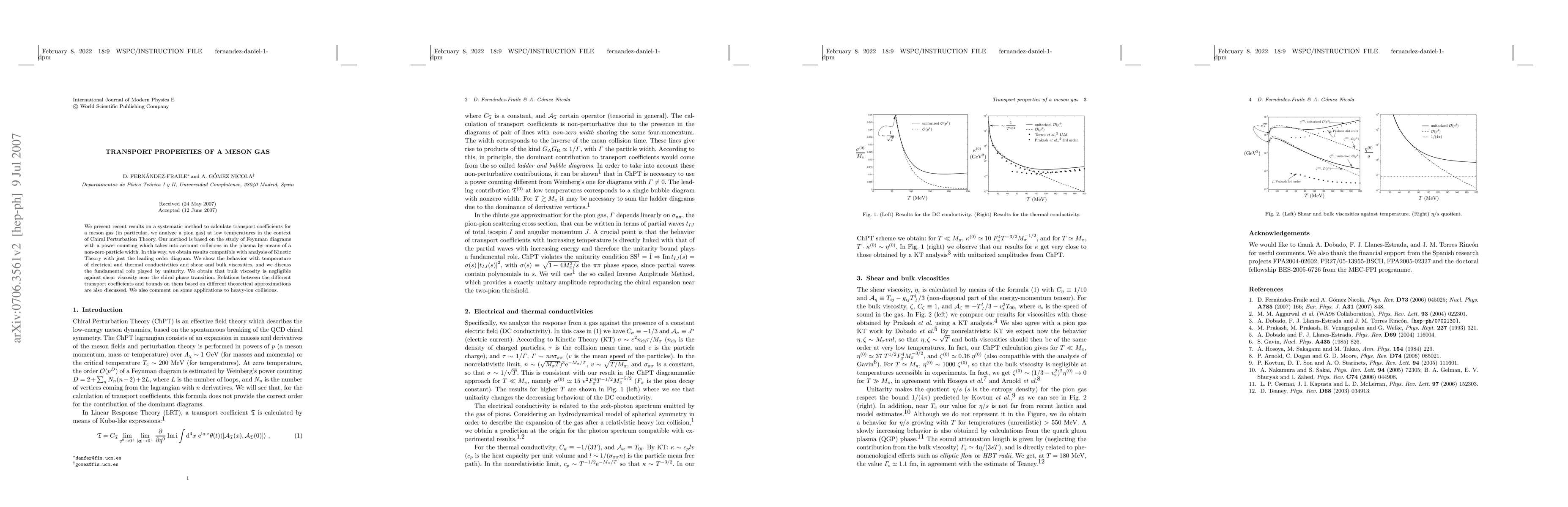 We present recent results on a systematic method to calculate transport coefficients for a meson gas (in particular, we analyze a pion gas) at low temperatures in the context of Chiral Perturbation Theory. Our method is based on the study of Feynman diagrams with a power counting which takes into account collisions in the plasma by means of a non-zero particle width. In this way, we obtain results compatible with analysis of Kinetic Theory with just the leading order diagram. We show the behavior with temperature of electrical and thermal conductivities and shear and bulk viscosities, and we discuss the fundamental role played by unitarity. We obtain that bulk viscosity is negligible against shear viscosity near the chiral phase transition. Relations between the different transport coefficients and bounds on them based on different theoretical approximations are also discussed. We also comment on some applications to heavy-ion collisions.