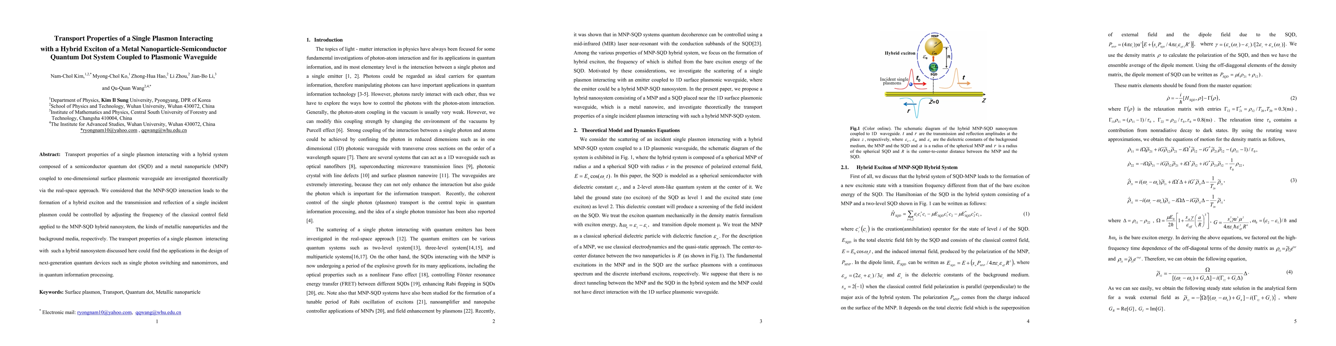 This paper investigates the transport properties of a single plasmon interacting with a hybrid exciton formed by a semiconductor quantum dot and a metal nanoparticle, coupled to a plasmonic waveguide. The study reveals that the transmission and reflection of the plasmon can be controlled by adjusting the frequency of a control field, the type of metal nanoparticle, and the surrounding medium, with potential applications in quantum devices and information processing.