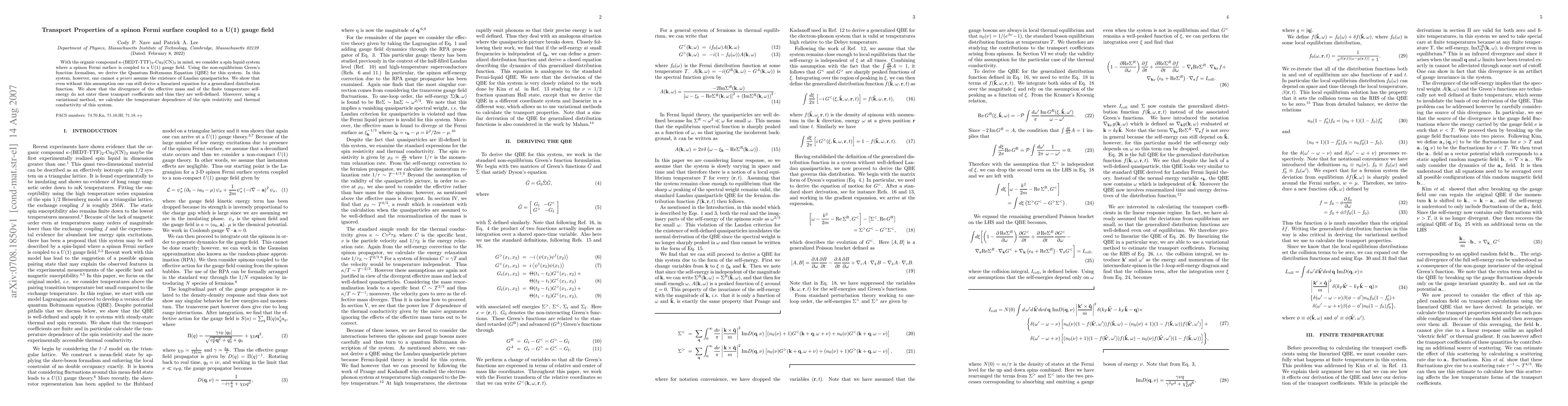 With the organic compound $\kappa$-(BEDT-TTF)$_2$-Cu$_2$(CN)$_3$ in mind, we consider a spin liquid system where a spinon Fermi surface is coupled to a U(1) gauge field. Using the non-equilibrium Green's function formalism, we derive the Quantum Boltzmann Equation (QBE) for this system. In this system, however, one cannot a priori assume the existence of Landau quasiparticles. We show that even without this assumption one can still derive a linearized equation for a generalized distribution function. We show that the divergence of the effective mass and of the finite temperature self-energy do not enter these transport coefficients and thus they are well-defined. Moreover, using a variational method, we calculate the temperature dependence of the spin resistivity and thermal conductivity of this system.