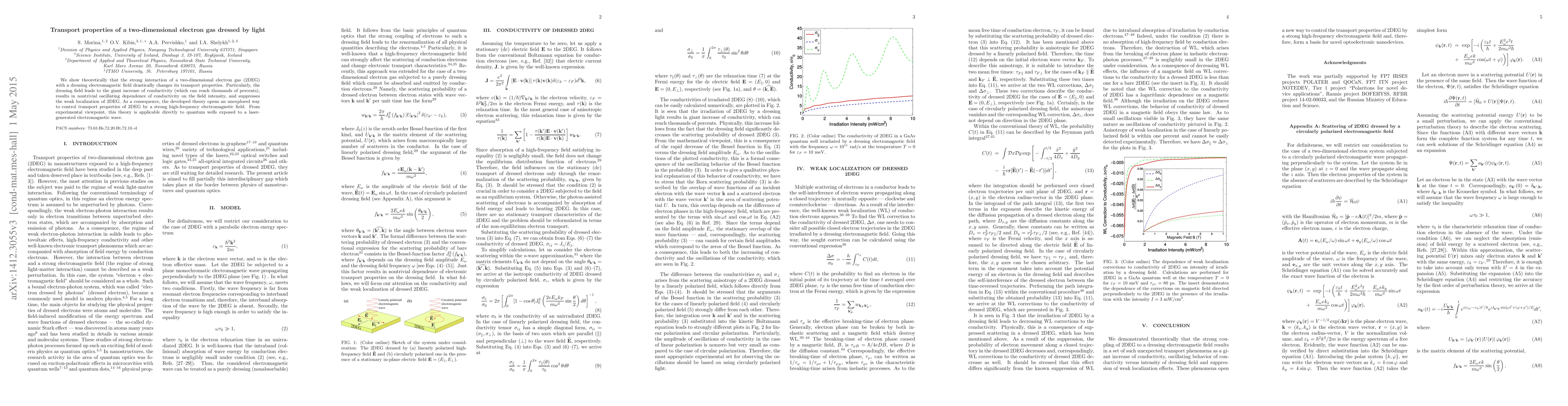 We show theoretically that the strong interaction of a two-dimensional electron gas (2DEG) with a dressing electromagnetic field drastically changes its transport properties. Particularly, the dressing field leads to the giant increase of conductivity (which can reach thousands of percents), results in nontrivial oscillating dependence of conductivity on the field intensity, and suppresses the weak localization of 2DEG. As a consequence, the developed theory opens an unexplored way to control transport properties of 2DEG by a strong high-frequency electromagnetic field. From experimental viewpoint, this theory is applicable directly to quantum wells exposed to a laser-generated electromagnetic wave.