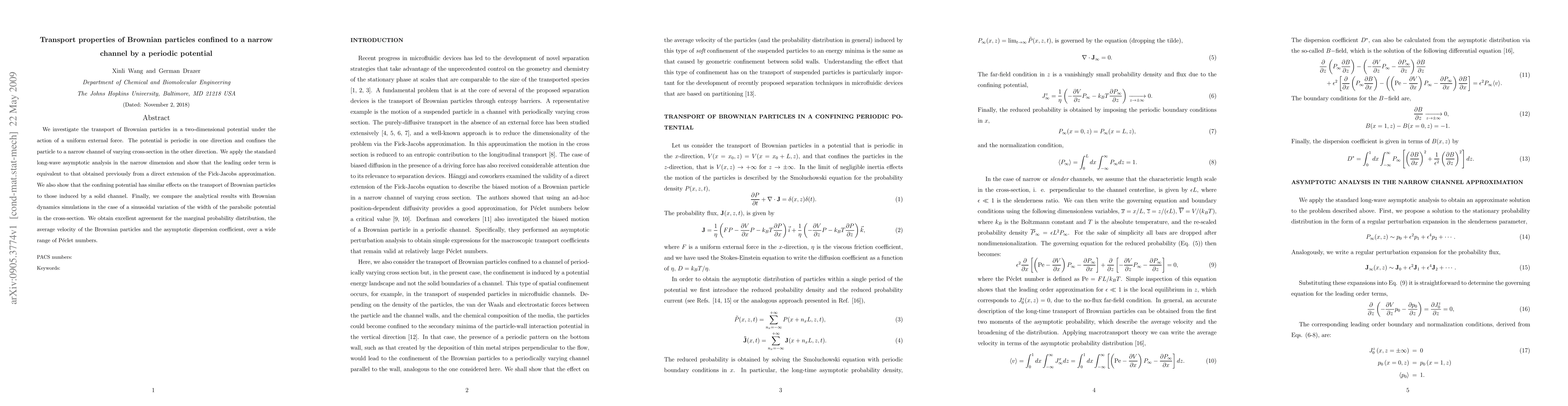 We investigate the transport of Brownian particles in a two-dimensional potential under the action of a uniform external force. The potential is periodic in one direction and confines the particle to a narrow channel of varying cross-section in the other direction. We apply the standard long-wave asymptotic analysis in the narrow dimension and show that the leading order term is equivalent to that obtained previously from a direct extension of the Fick-Jacobs approximation. We also show that the confining potential has similar effects on the transport of Brownian particles to those induced by a solid channel. Finally, we compare the analytical results with Brownian dynamics simulations in the case of a sinusoidal variation of the width of the parabolic potential in the cross-section. We obtain excellent agreement for the marginal probability distribution, the average velocity of the Brownian particles and the asymptotic dispersion coefficient, over a wide range of Peclet numbers.