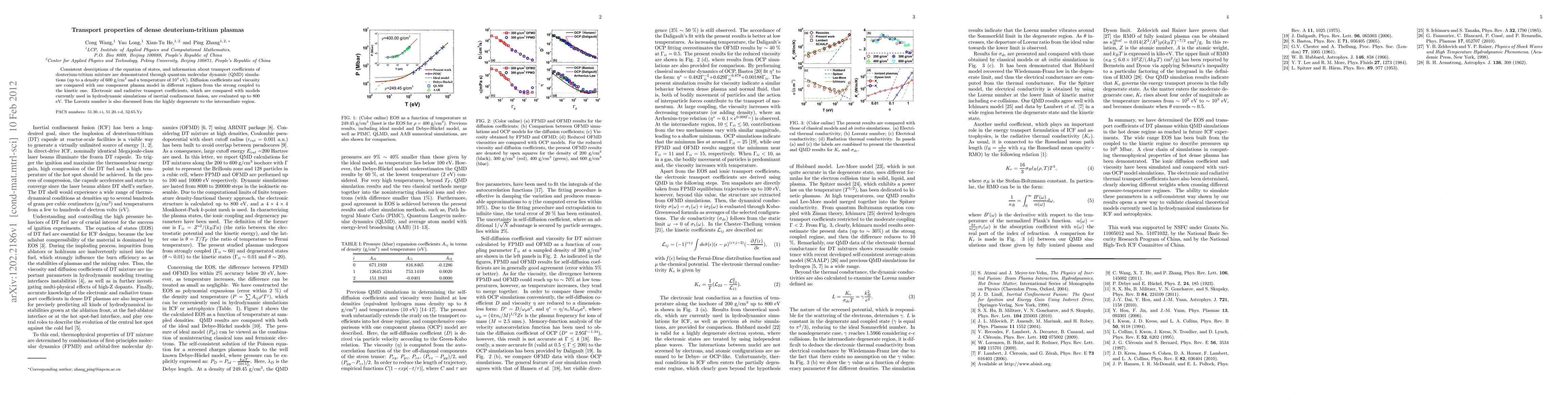 This paper uses quantum molecular dynamics simulations to study the transport properties of dense deuterium-tritium plasmas, evaluating diffusion coefficients, viscosity, and transport coefficients up to 800 eV, and comparing them with models used in fusion simulations. The Lorentz number is also analyzed across different plasma regimes.