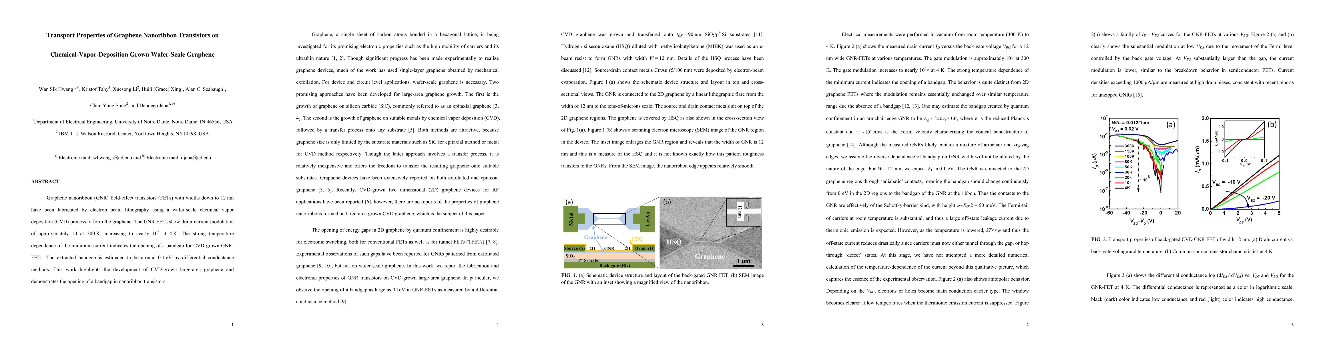 Summary: This study fabricates graphene nanoribbon field-effect transistors (GNR-FETs) using electron beam lithography on wafer-scale graphene grown via chemical vapor deposition (CVD), showing a significant bandgap opening at low temperatures, estimated at 0.1 eV, and a strong temperature-dependent current modulation.