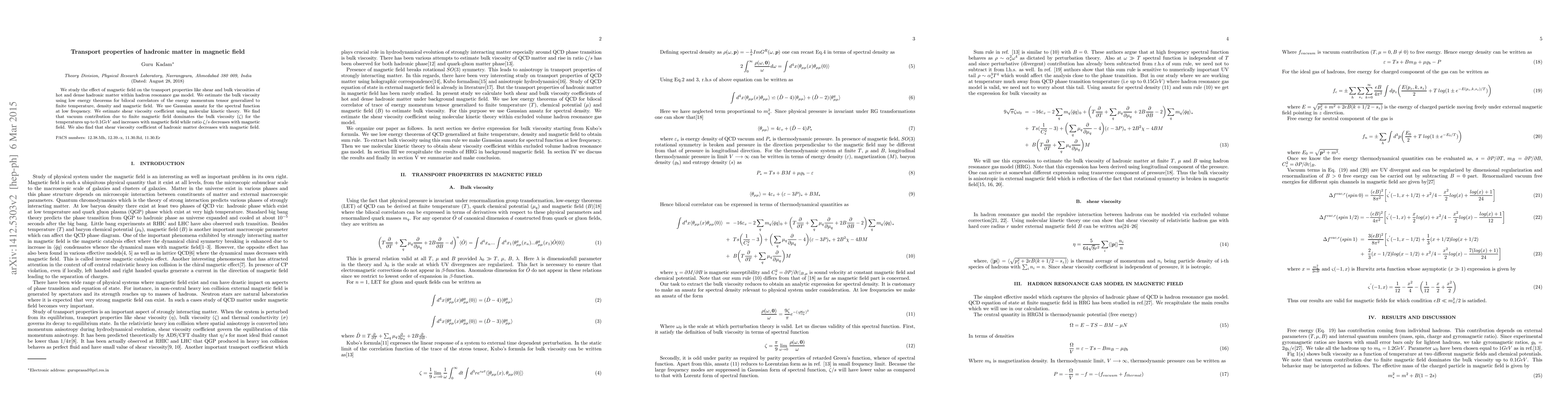 We study the effect of magnetic field on the transport properties like shear and bulk viscosities of hot and dense hadronic matter within hadron resonance gas model. We estimate the bulk viscosity using low energy theorems for bilocal correlators of the energy momentum tensor generalized to finite temperature, density and magnetic field. We use Gaussian ansatz for the spectral function at low frequency. We estimate shear viscosity coefficient using molecular kinetic theory. We find that vacuum contribution due to finite magnetic field dominates the bulk viscosity ({\zeta}) for the temperatures up to 0.1GeV and increases with magnetic field while ratio {\zeta}/s decreases with magnetic field. We also find that shear viscosity coefficient of hadronic matter decreases with magnetic field.