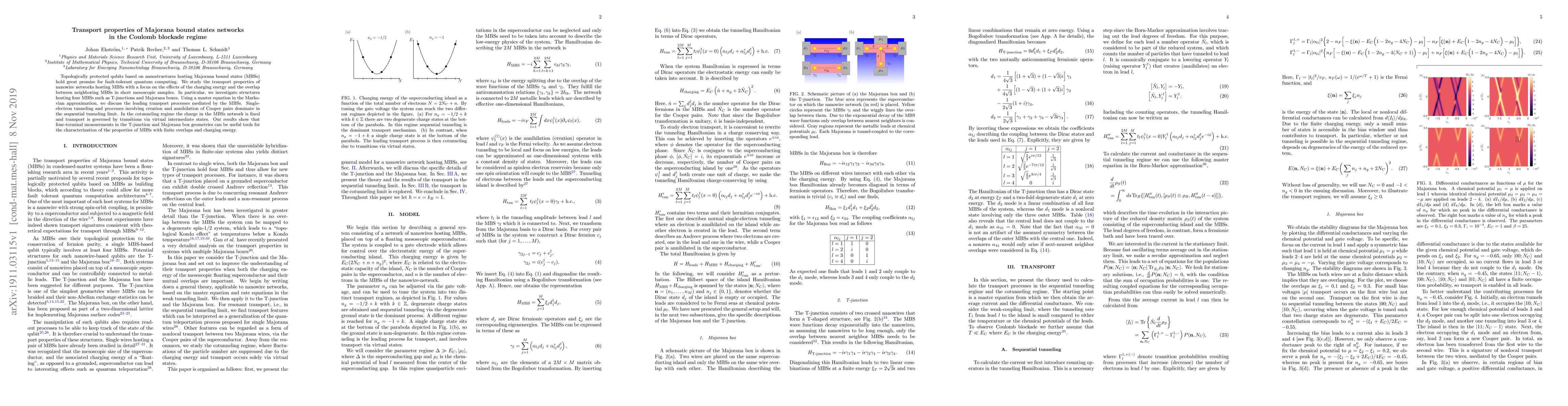 Topologically protected qubits based on nanostructures hosting Majorana bound states (MBSs) hold great promise for fault-tolerant quantum computing. We study the transport properties of nanowire networks hosting MBSs with a focus on the effects of the charging energy and the overlap between neighboring MBSs in short mesoscopic samples. In particular, we investigate structures hosting four MBSs such as T-junctions and Majorana boxes. Using a master equation in the Markovian approximation, we discuss the leading transport processes mediated by the MBSs. Single-electron tunneling and processes involving creation and annihilation of Cooper pairs dominate in the sequential tunneling limit. In the cotunneling regime the charge in the MBSs network is fixed and transport is governed by transitions via virtual intermediate states. Our results show that four-terminal measurements in the T-junction and Majorana box geometries can be useful tools for the characterization of the properties of MBSs with finite overlaps and charging energy.