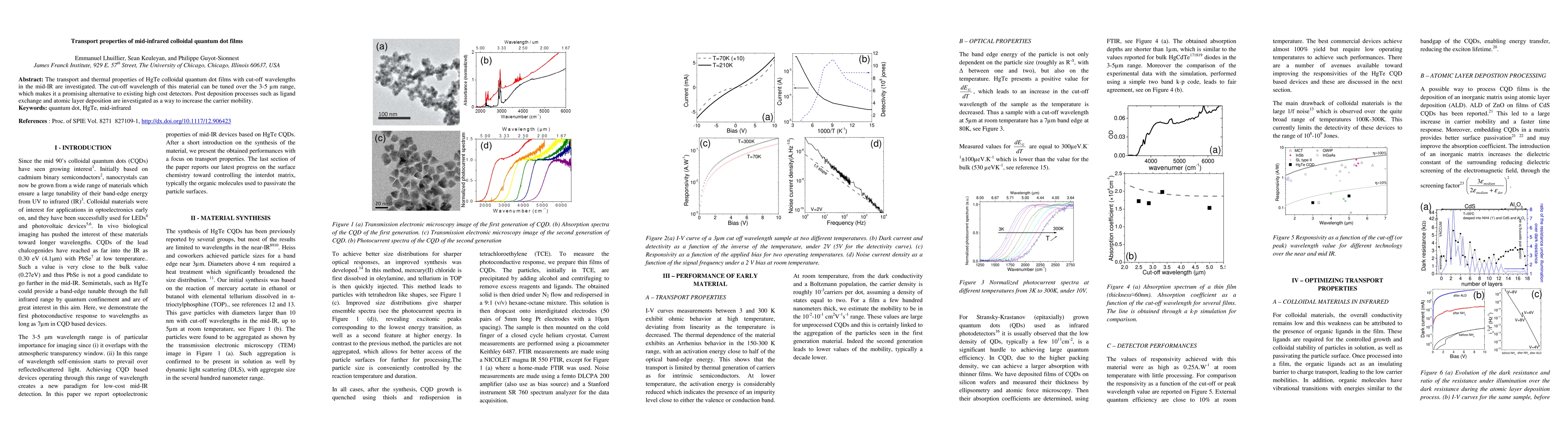The transport and thermal properties of HgTe colloidal quantum dot films with cut-off wavelengths in the mid-IR are investigated. The cut-off wavelength of this material can be tuned over the 3-5 \mu m range, which makes it a promising alternative to existing high cost detectors. Post deposition processes such as ligand exchange and atomic layer deposition are investigated as a way to increase the carrier mobility.