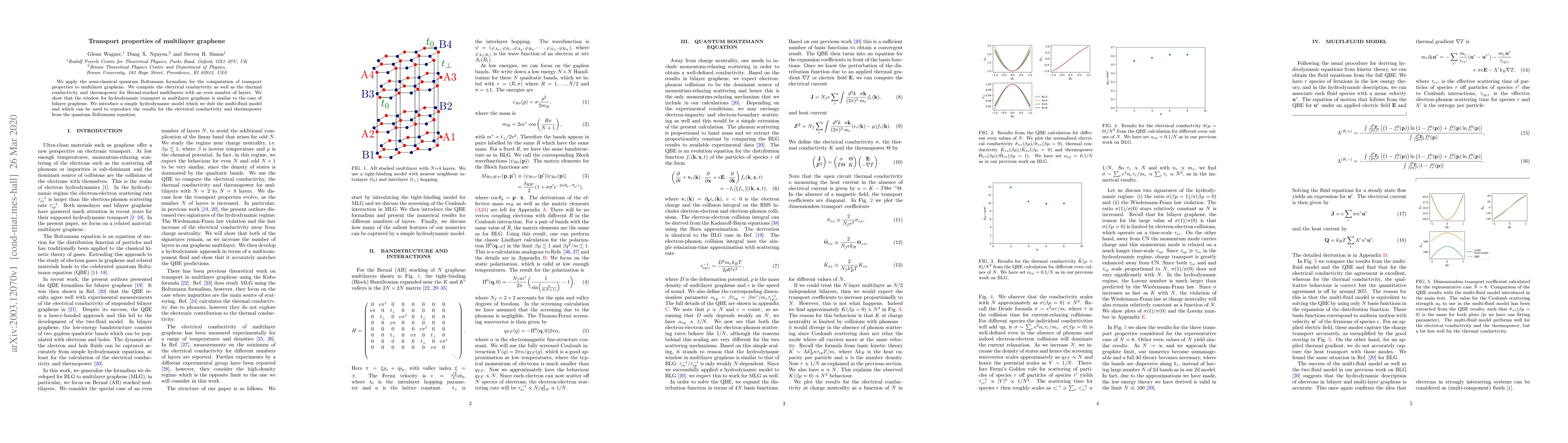 We apply the semi-classical quantum Boltzmann formalism for the computation of transport properties to multilayer graphene. We compute the electrical conductivity as well as the thermal conductivity and thermopower for Bernal-stacked multilayers with an even number of layers. We show that the window for hydrodynamic transport in multilayer graphene is similar to the case of bilayer graphene. We introduce a simple hydrodynamic model which we dub the multi-fluid model and which can be used to reproduce the results for the electrical conductivity and thermopower from the quantum Boltzmann equation.