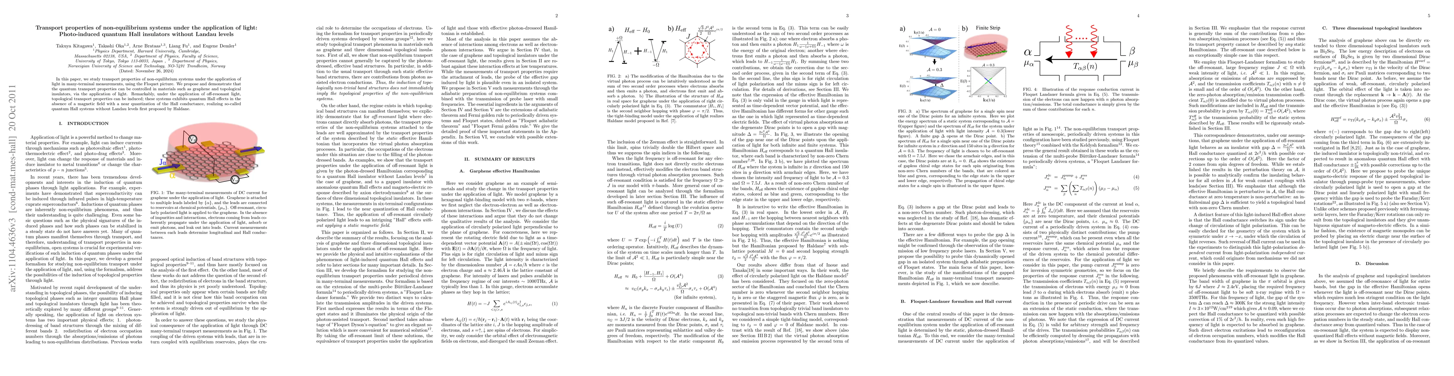 This paper investigates the transport properties of non-equilibrium systems under light, demonstrating that off-resonant light can induce quantum Hall effects in materials like graphene and topological insulators without traditional Landau levels, achieving near-quantized Hall conductance.