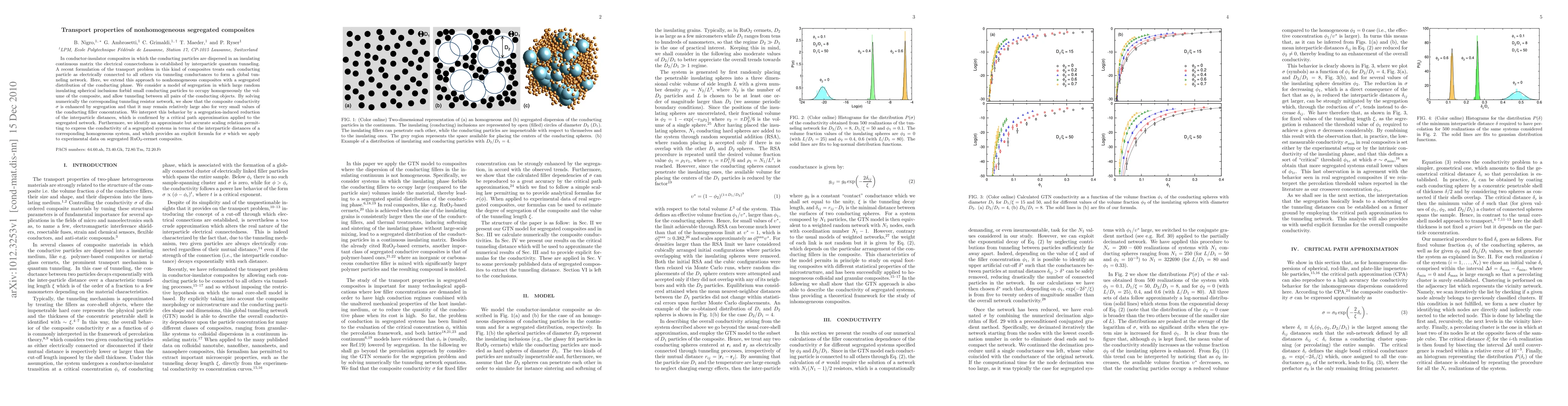 This paper investigates the transport properties of nonhomogeneous segregated composites where conducting particles are dispersed in an insulating matrix, focusing on the impact of segregation on composite conductivity. The study reveals that segregation enhances conductivity by reducing interparticle distances, allowing for significant conductivity even at low filler concentrations.
