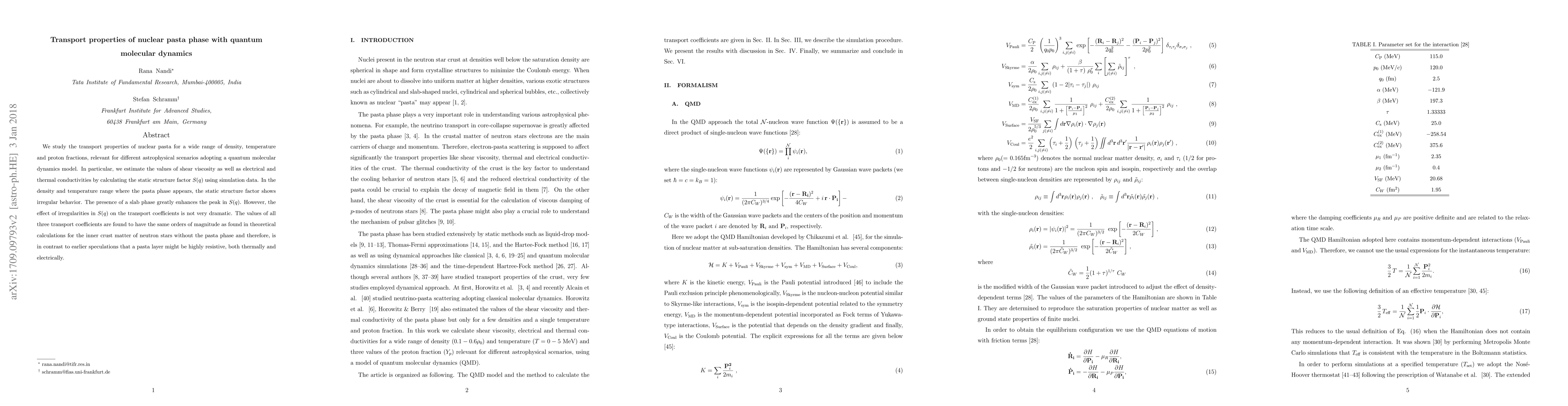 The paper presents a detailed analysis of transport properties using quantum molecular dynamics, providing new insights into the behavior of nuclear pasta phases relevant for neutron star crusts.