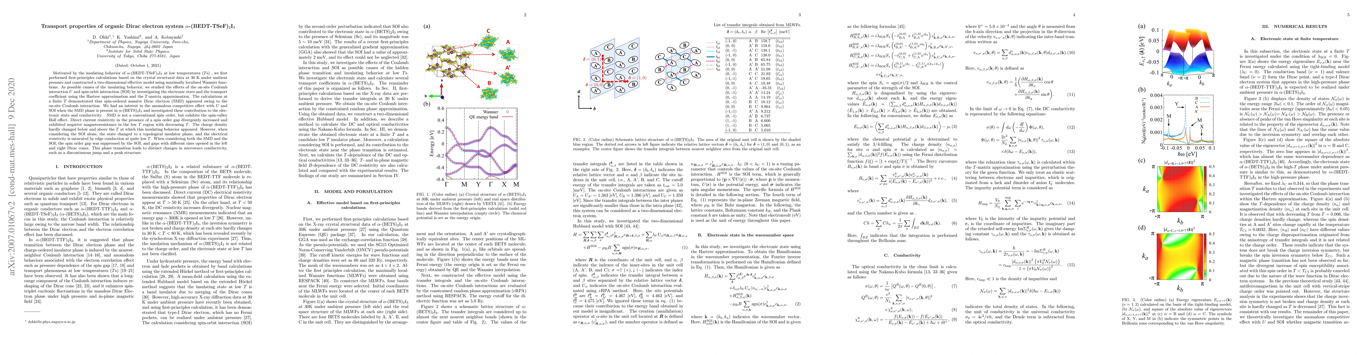 Motivated by the insulating behavior of $\alpha$-(BEDT-TSeF)$_2$I$_3$ at low temperatures ($T$'s), we first performed first-principles calculations based on the crystal structural data at 30 K under ambient pressure, and we constructed a two-dimensional effective model using maximally localized Wannier functions. As possible causes of the insulating behavior, we studied the effects of the on-site Coulomb interaction $U$ and spin-orbit interaction (SOI) by investigating the electronic state and the transport coefficient using the Hartree approximation and the $T$-matrix approximation. The calculations at a finite $T$ demonstrated that a spin-ordered massive Dirac electron (SMD) appeared due to the on-site Coulomb interaction. We had an interest in the anomalous competitive effect with $U$ and SOI when the SMD phase is present in $\alpha$-(BETS)$_2$I$_3$, and we investigated these contributions to the electronic state and conductivity. The SMD is not a conventional spin order, but it exhibits the spin-valley Hall effect. Direct current resistivity in the presence of a spin order gap increased divergently and exhibited negative magnetoresistance in the low $T$ region with decreasing $T$. The charge density hardly changed below and above the $T$ at which this insulating behavior appeared. However, when considering the SOI alone, the state changed to a topological insulator phase, and the electrical resistivity is saturated by edge conduction at quite low $T$. When considering both the SMD and the SOI, the spin order gap was suppressed by the SOI, and gaps with different sizes opened in the left and right Dirac cones. This phase transition leads to distinct changes in microwave conductivity, such as a discontinuous jump and a peak structure.