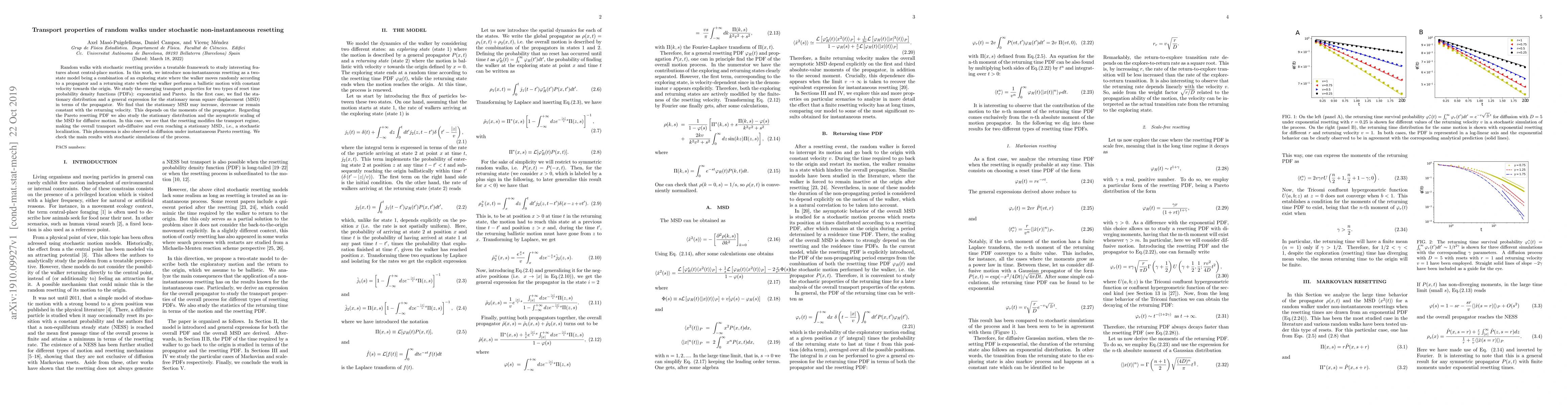 This paper explores random walks with stochastic non-instantaneous resetting, combining an exploring state with a returning state involving ballistic motion towards the origin. It investigates transport properties under exponential and Pareto resetting PDFs, finding that resetting can lead to stochastic localization and modify the transport regime to sub-diffusive.