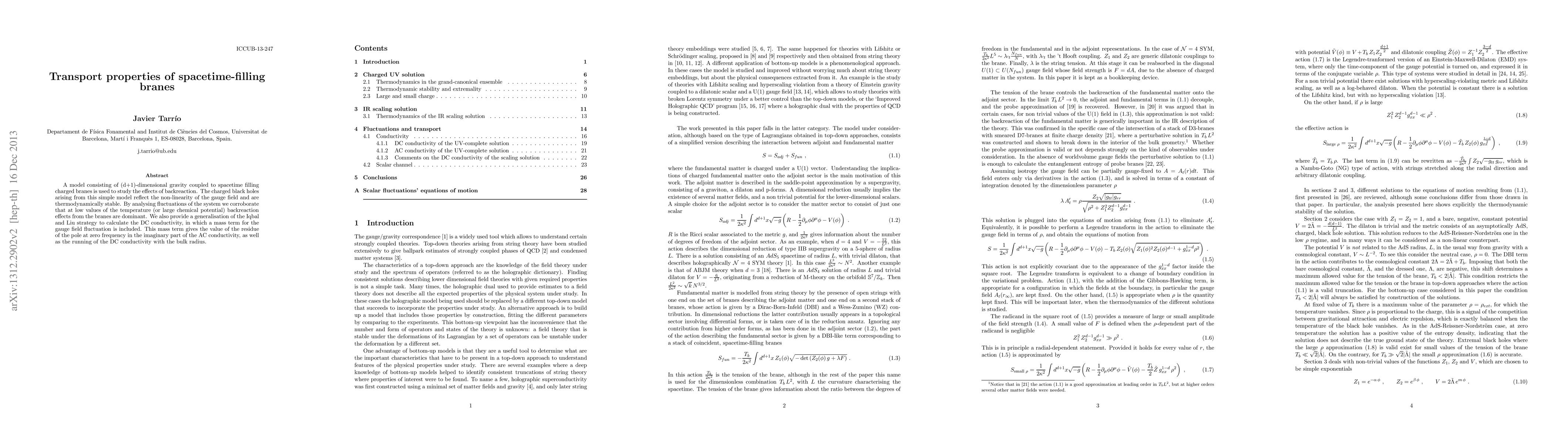 This research investigates a model of gravity coupled to spacetime-filling charged branes, finding that charged black holes are thermodynamically stable and dominated by backreaction effects at low temperatures. The study generalizes the Iqbal and Liu strategy to calculate DC conductivity, including a mass term for gauge field fluctuation, which provides the residue of the zero-frequency pole in the imaginary part of AC conductivity and describes the DC conductivity's variation with bulk radius.