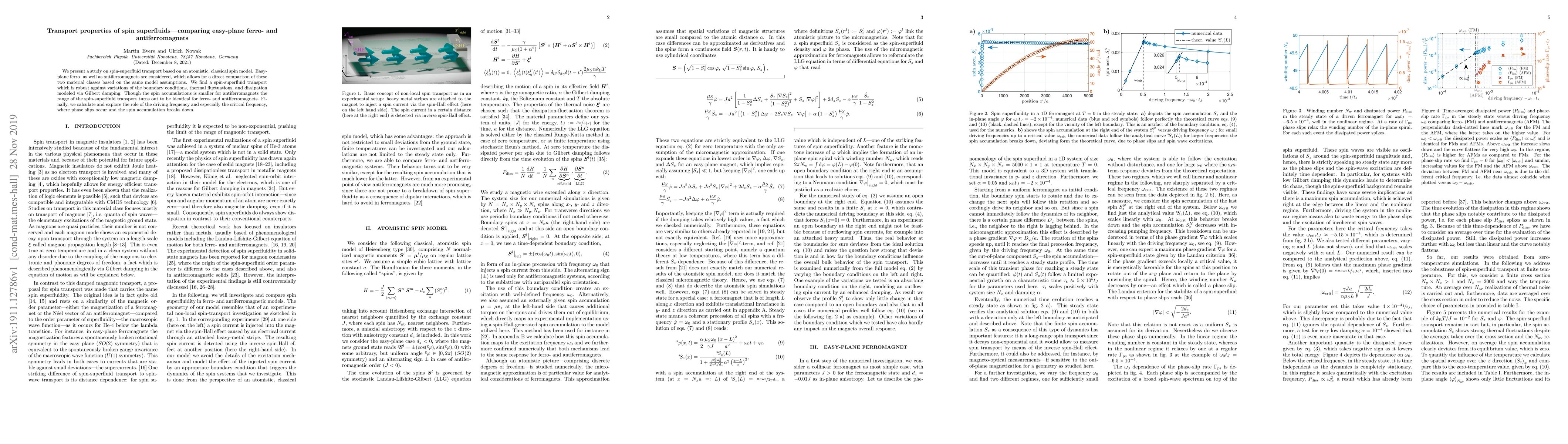 We present a study on spin-superfluid transport based on an atomistic, classical spin model. Easy-plane ferro- as well as antiferromagnets are considered, which allows for a direct comparison of these two material classes based on the same model assumptions. We find a spin-superfluid transport which is robust against variations of the boundary conditions, thermal fluctuations, and dissipation modeled via Gilbert damping. Though the spin accumulations is smaller for antiferromagnets the range of the spin-superfluid transport turns out to be identical for ferro- and antiferromagnets. Finally, we calculate and explore the role of the driving frequency and especially the critical frequency, where phase slips occur and the spin accumulation breaks down.
