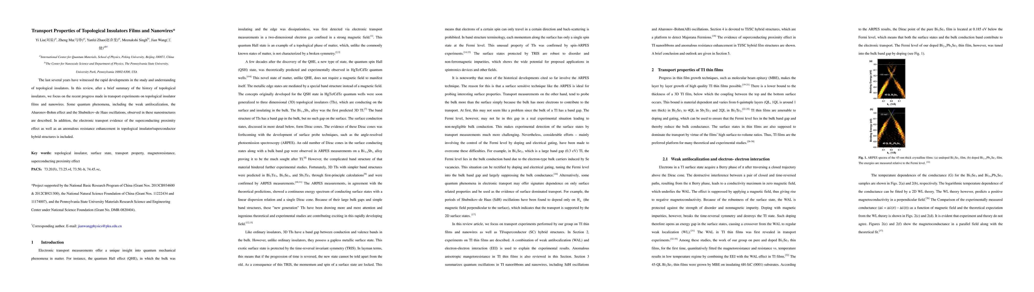 This review summarizes recent advances in the transport properties of topological insulator films and nanowires, highlighting quantum phenomena such as weak antilocalization and the superconducting proximity effect observed in these structures. It also discusses the anomalous resistance enhancements in topological insulator/superconductor hybrids.