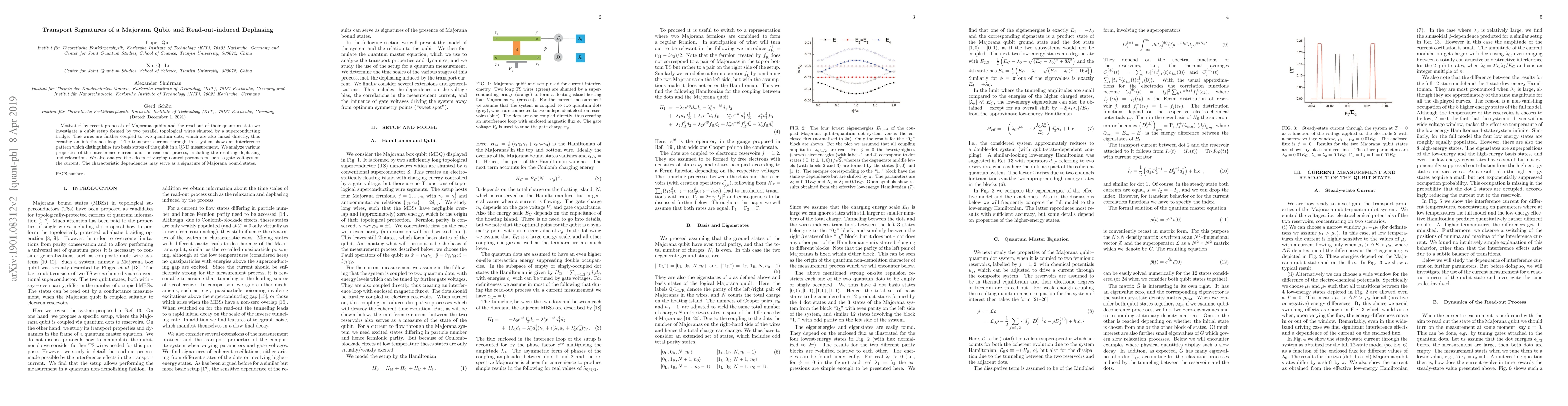 This paper examines a setup involving two parallel topological wires with a superconducting bridge, coupled to quantum dots to form a Majorana qubit. The study focuses on transport current interference patterns and the signatures of qubit read-out-induced dephasing, analyzing how control parameters affect these properties and their potential as signatures of Majorana bound states.