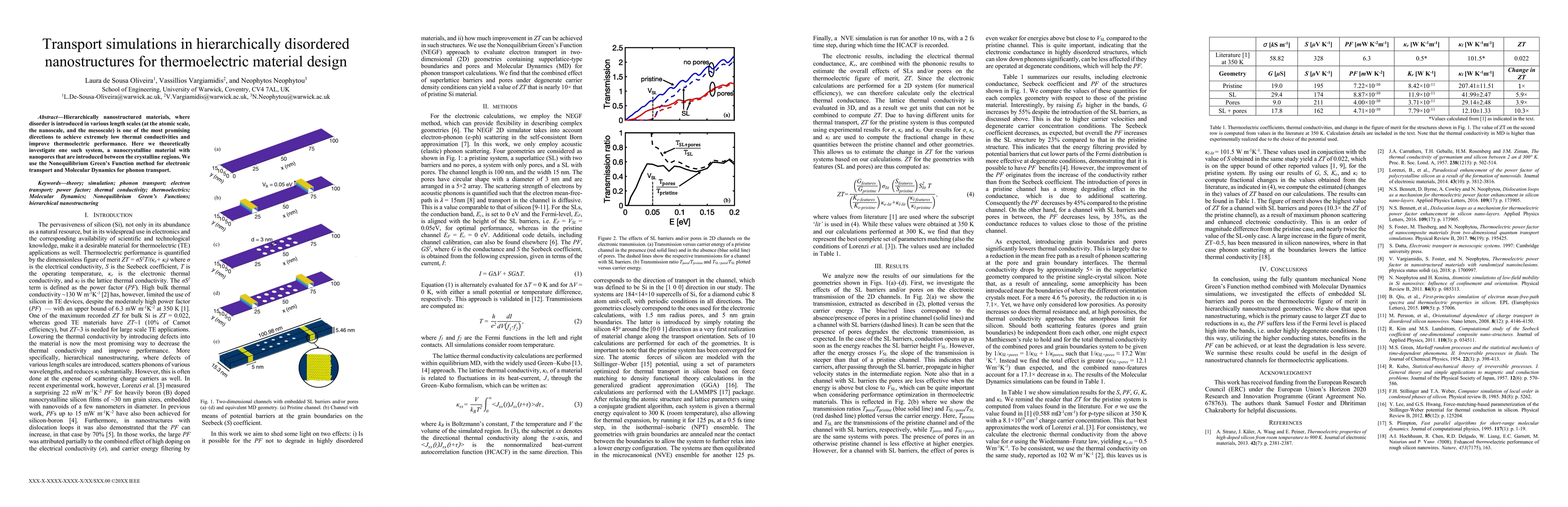 This paper investigates nanocrystalline materials with nanopores to enhance thermoelectric performance by introducing disorder at multiple length scales. The study employs Nonequilibrium Greens Function for electronic transport and Molecular Dynamics for phonon transport to simulate the material's transport properties.