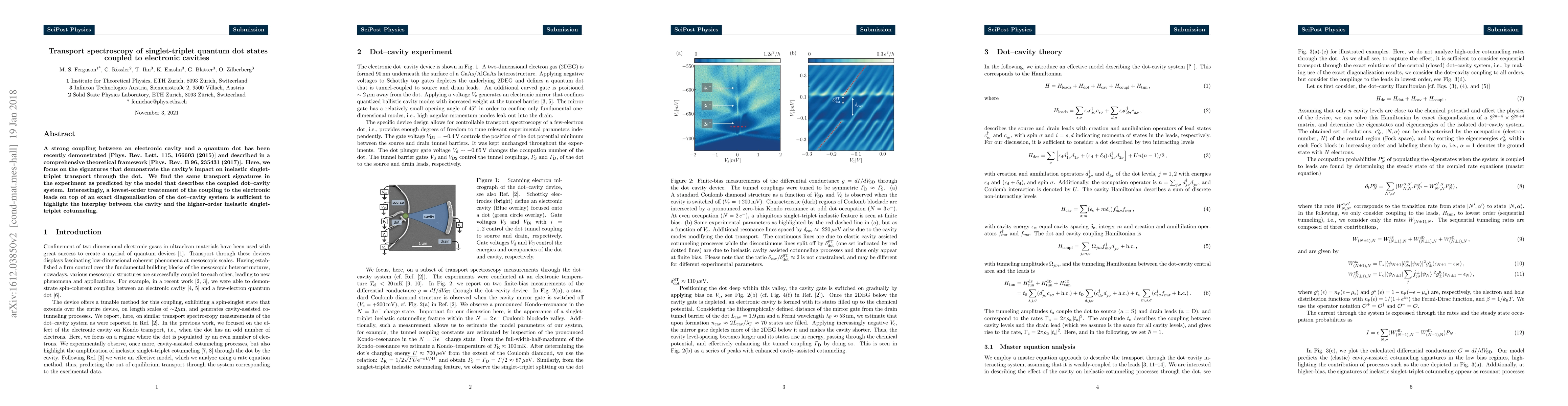 A strong coupling between an electronic cavity and a quantum dot has been recently demonstrated [Phys. Rev. Lett. 115, 166603 (2015)] and described in a comprehensive theoretical framework [Phys. Rev. B 96, 235431 (2017)]. Here, we focus on the signatures that demonstrate the cavity's impact on inelastic singlet-triplet transport through the dot. We find the same transport signatures in the experiment as predicted by the model that describes the coupled dot--cavity system. Interestingly, a lowest-order treatement of the coupling to the electronic leads on top of an exact diagonalisation of the dot-cavity system is sufficient to highlight the interplay between the cavity and the higher-order inelastic singlet-triplet cotunneling.