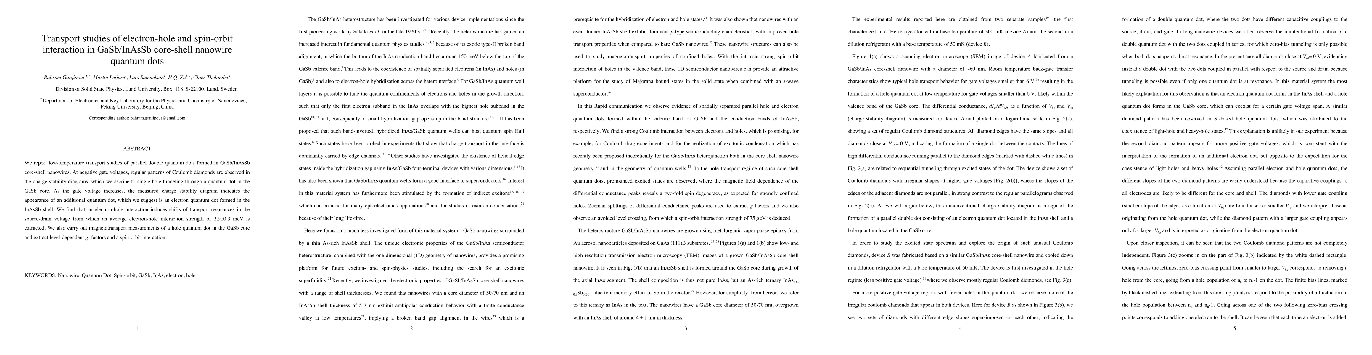 This study investigates the transport properties of GaSb/InAsSb core-shell nanowire quantum dots, revealing single-hole tunneling and the formation of an additional electron quantum dot in the shell. The research extracts an average electron-hole interaction strength of 2.9 meV and determines level-dependent g-factors and spin-orbit interaction through magnetotransport measurements.