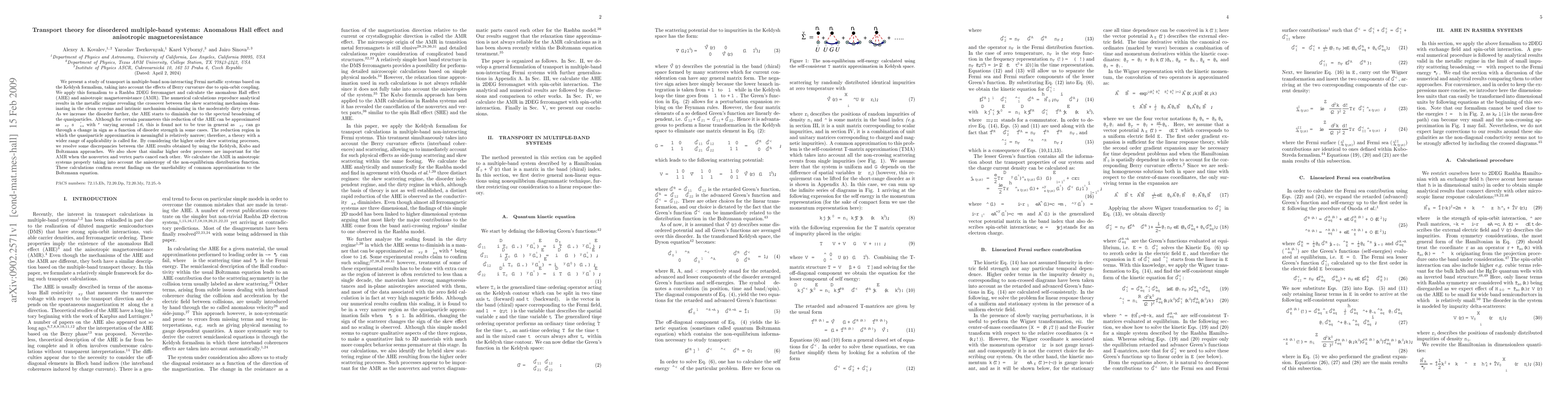 We present a study of transport in multiple-band non-interacting Fermi metallic systems based on the Keldysh formalism, taking into account the effects of Berry curvature due to spin-orbit coupling. We apply this formalism to a Rashba 2DEG ferromagnet and calculate the anomalous Hall effect (AHE) and anisotropic magnetoresistance (AMR). The numerical calculations reproduce analytical results in the metallic regime revealing the crossover between the skew scattering mechanism dominating in the clean systems and intrinsic mechanism dominating in the moderately dirty systems. As we increase the disorder further, the AHE starts to diminish due to the spectral broadening of the quasiparticles. Although for certain parameters this reduction of the AHE can be approximated as $\sigma_{xy}\thicksim\sigma_{xx}^{\varphi}$ with $\varphi$ varying around 1.6, this is found not to be true in general as $\sigma_{xy}$ can go through a change in sign as a function of disorder strength in some cases. The reduction region in which the quasiparticle approximation is meaningful is relatively narrow; therefore, a theory with a wider range of applicability is called for. By considering the higher order skew scattering processes, we resolve some discrepancies between the AHE results obtained by using the Keldysh, Kubo and Boltzmann approaches. We also show that similar higher order processes are important for the AMR when the nonvertex and vertex parts cancel each other. We calculate the AMR in anisotropic systems properly taking into account the anisotropy of the non-equilibrium distribution function. These calculations confirm recent findings on the unreliability of common approximations to the Boltzmann equation.