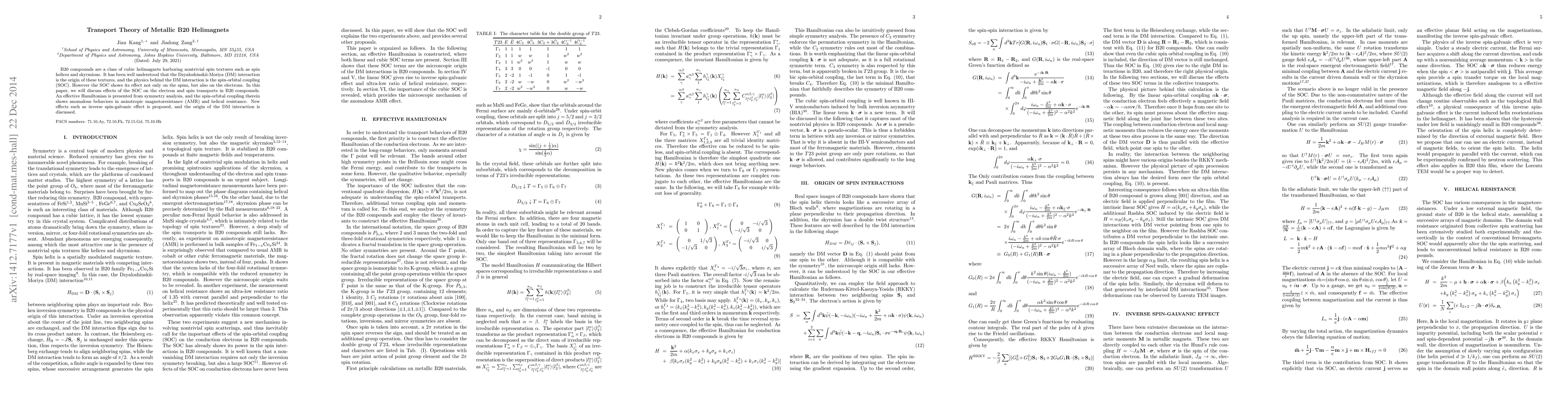 B20 compounds are a class of cubic helimagnets harboring nontrivial spin textures such as spin helices and skyrmions. It has been well understood that the Dzyaloshinskii-Moriya (DM) interaction is the origin of these textures, and the physics behind the DM interaction is the spin-orbital coupling (SOC). However the SOC shows its effect not only on the spins, but also on the electrons. In this paper, we will discuss effects of the SOC on the electron and spin transports in B20 compounds. An effective Hamiltonian is presented from symmetry analysis, and the spin-orbital coupling therein shows anomalous behaviors in anisotropic magnetoresistance (AMR) and helical resistance. New effects such as inverse spin-galvanic effect is proposed, and the origin of the DM interaction is discussed.