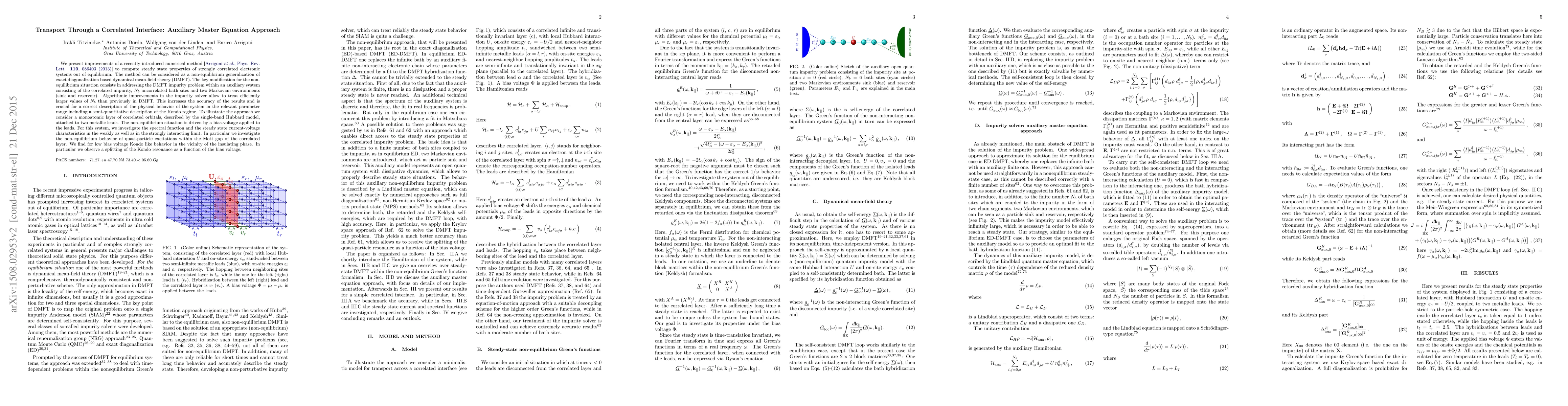 We present improvements of a recently introduced numerical method [Arrigoni etal, Phys. Rev. Lett. 110, 086403 (2013)] to compute steady state properties of strongly correlated electronic systems out of equilibrium. The method can be considered as a non-equilibrium generalization of exact diagonalization based dynamical mean-field theory (DMFT). The key modification for the non-equilibrium situation consists in addressing the DMFT impurity problem within an auxiliary system consisting of the correlated impurity, $N_b$ uncorrelated bath sites and two Markovian environments (sink and reservoir). Algorithmic improvements in the impurity solver allow to treat efficiently larger values of $N_b$ than previously in DMFT. This increases the accuracy of the results and is crucial for a correct description of the physical behavior of the system in the relevant parameter range including a semi-quantitative description of the Kondo regime. To illustrate the approach we consider a monoatomic layer of correlated orbitals, described by the single-band Hubbard model, attached to two metallic leads. The non-equilibrium situation is driven by a bias-voltage applied to the leads. For this system, we investigate the spectral function and the steady state current-voltage characteristics in the weakly as well as in the strongly interacting limit. In particular we investigate the non-equilibrium behavior of quasi-particle excitations within the Mott gap of the correlated layer. We find for low bias voltage Kondo like behavior in the vicinity of the insulating phase. In particular we observe a splitting of the Kondo resonance as a function of the bias voltage.