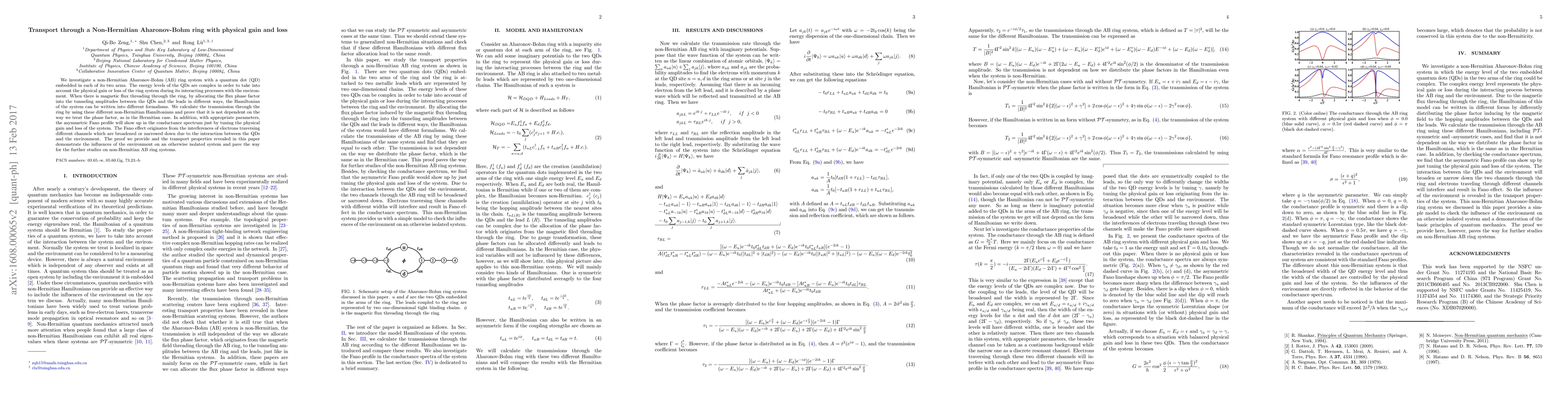 Researchers investigate a non-Hermitian Aharonov-Bohm ring system with embedded quantum dots, finding that transmission through the ring is not dependent on how it's treated as non-Hermitian, and can exhibit an asymmetric Fano profile due to environmental interactions.