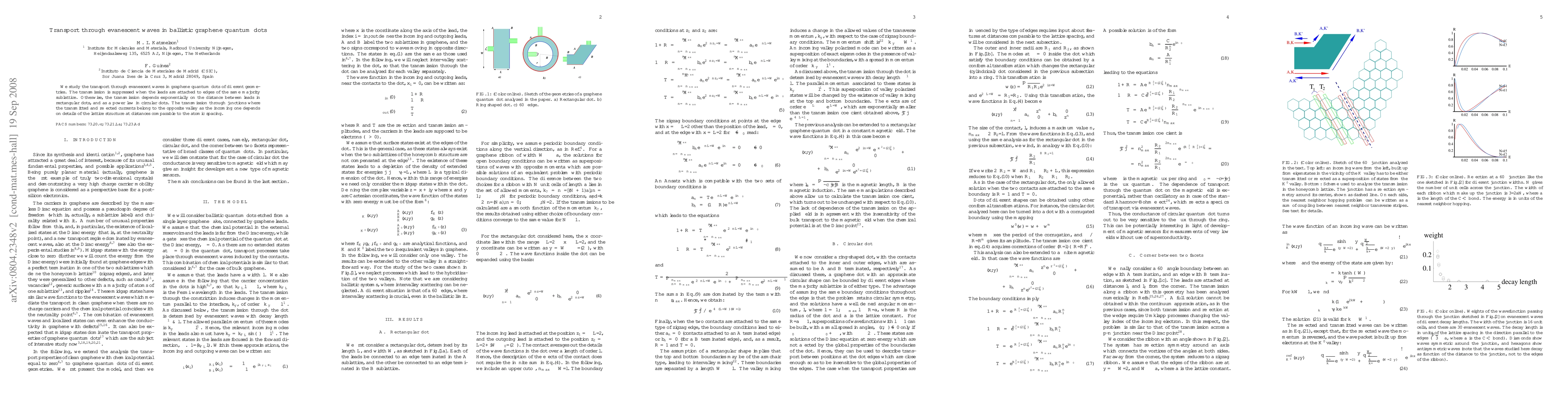 This paper investigates transport properties in graphene quantum dots via evanescent waves, finding that transmission is suppressed when leads connect to the same sublattice edges. In rectangular dots, transmission decays exponentially with lead distance, while in circular dots, it follows a power law, with lattice structure details influencing transmission at atomic scales.