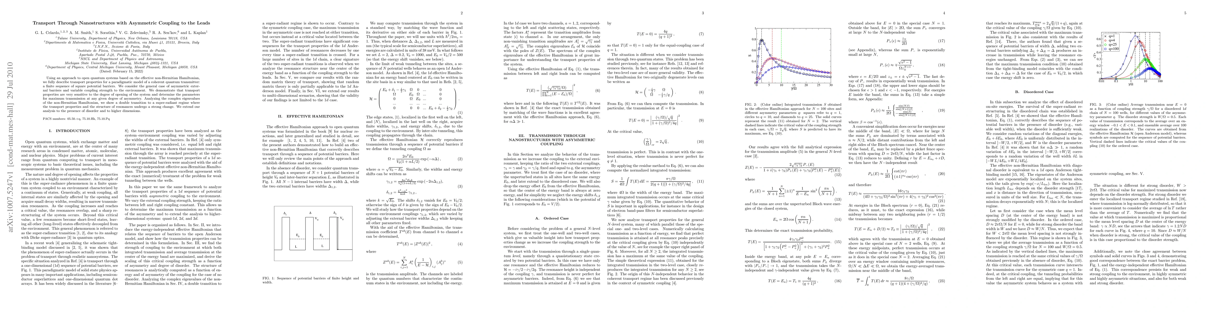 Using an approach to open quantum systems based on the effective non-Hermitian Hamiltonian, we fully describe transport properties for a paradigmatic model of a coherent quantum transmitter: a finite sequence of square potential barriers. We consider the general case of asymmetric external barriers and variable coupling strength to the environment. We demonstrate that transport properties are very sensitive to the degree of opening of the system and determine the parameters for maximum transmission at any given degree of asymmetry. Analyzing the complex eigenvalues of the non-Hermitian Hamiltonian, we show a double transition to a super-radiant regime where the transport properties and the structure of resonances undergo a strong change. We extend our analysis to the presence of disorder and to higher dimensions.