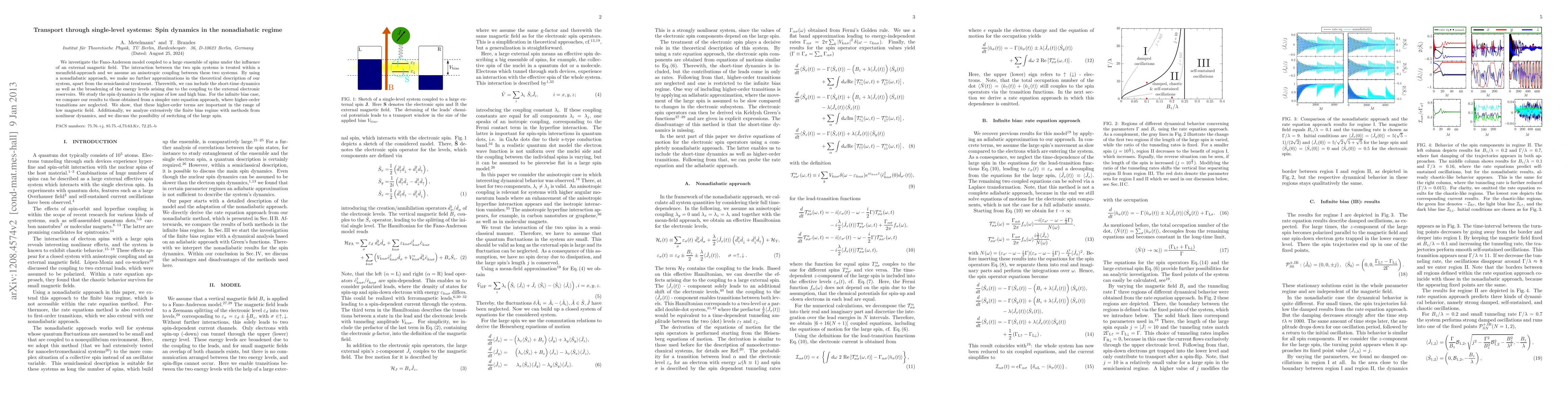 We investigate the Fano-Anderson model coupled to a large ensemble of spins under the influence of an external magnetic field. The interaction between the two spin systems is treated within a meanfield-approach and we assume an anisotropic coupling between these two systems. By using a nonadiabatic approach, we make no further approximations in the theoretical description of our system, apart from the semiclassical treatment. Therewith, we can include the short-time dynamics as well as the broadening of the energy levels arising due to the coupling to the external electronic reservoirs. We study the spin dynamics in the regime of low and high bias. For the infinite bias case, we compare our results to those obtained from a simpler rate equation approach, where higher-order transitions are neglected. We show, that these higher-order terms are important in the range of low magnetic field. Additionally, we analyze extensively the finite bias regime with methods from nonlinear dynamics, and we discuss the possibility of switching of the large spin.