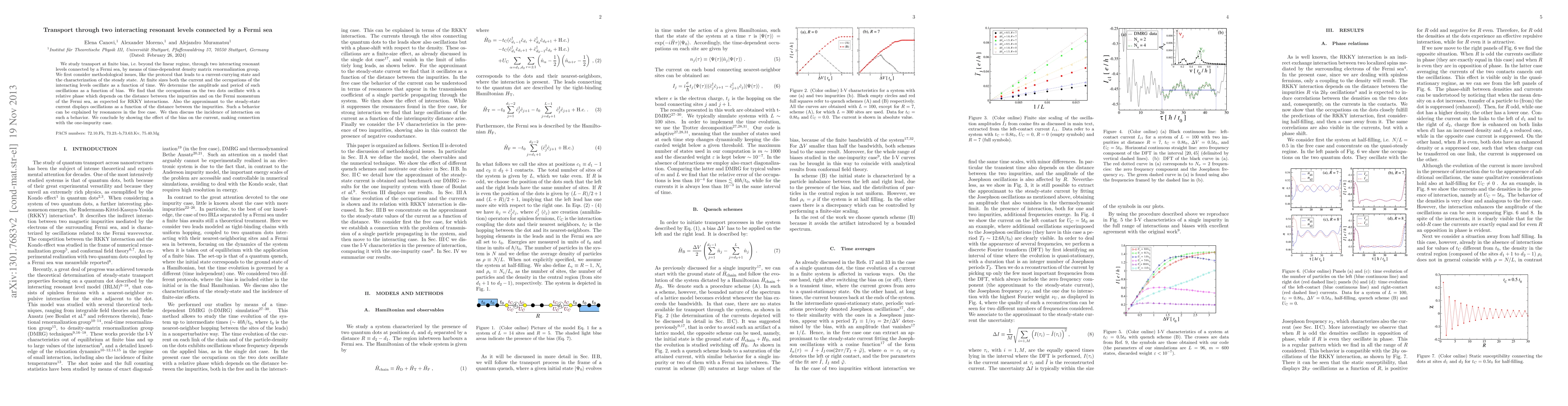 This paper investigates transport through two interacting resonant levels connected by a Fermi sea using time-dependent density matrix renormalization group. It reveals oscillations in current and occupations at finite bias, with the relative phase of oscillations depending on impurity distance and Fermi momentum, indicative of RKKY interactions.