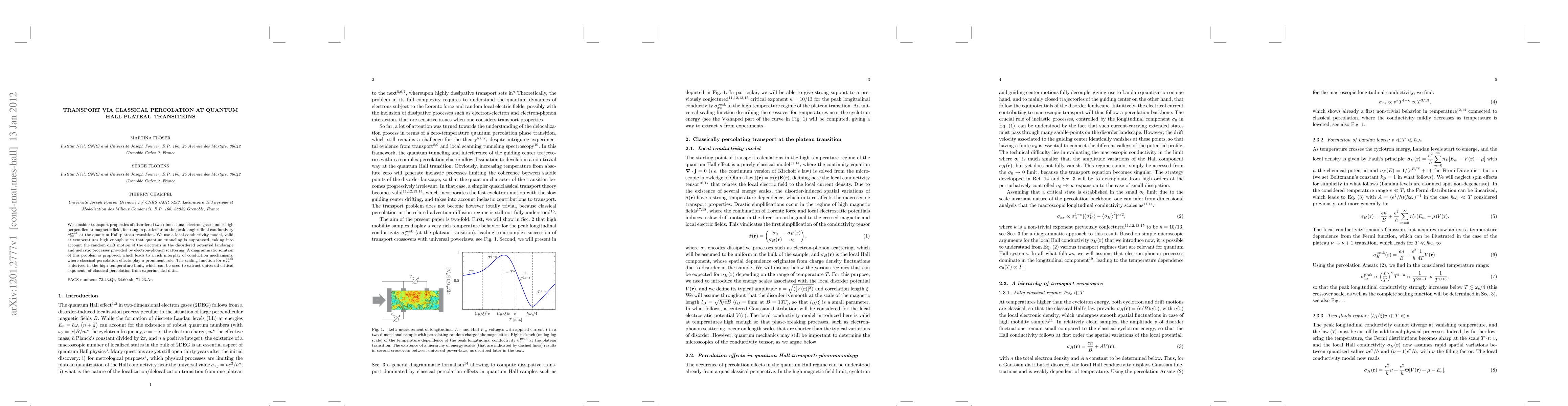We consider transport properties of disordered two-dimensional electron gases under high perpendicular magnetic field, focusing in particular on the peak longitudinal conductivity $\sigma_{xx}^\mathrm{peak}$ at the quantum Hall plateau transition. We use a local conductivity model, valid at temperatures high enough such that quantum tunneling is suppressed, taking into account the random drift motion of the electrons in the disordered potential landscape and inelastic processes provided by electron-phonon scattering. A diagrammatic solution of this problem is proposed, which leads to a rich interplay of conduction mechanisms, where classical percolation effects play a prominent role. The scaling function for $\sigma_{xx}^\mathrm{peak}$ is derived in the high temperature limit, which can be used to extract universal critical exponents of classical percolation from experimental data.