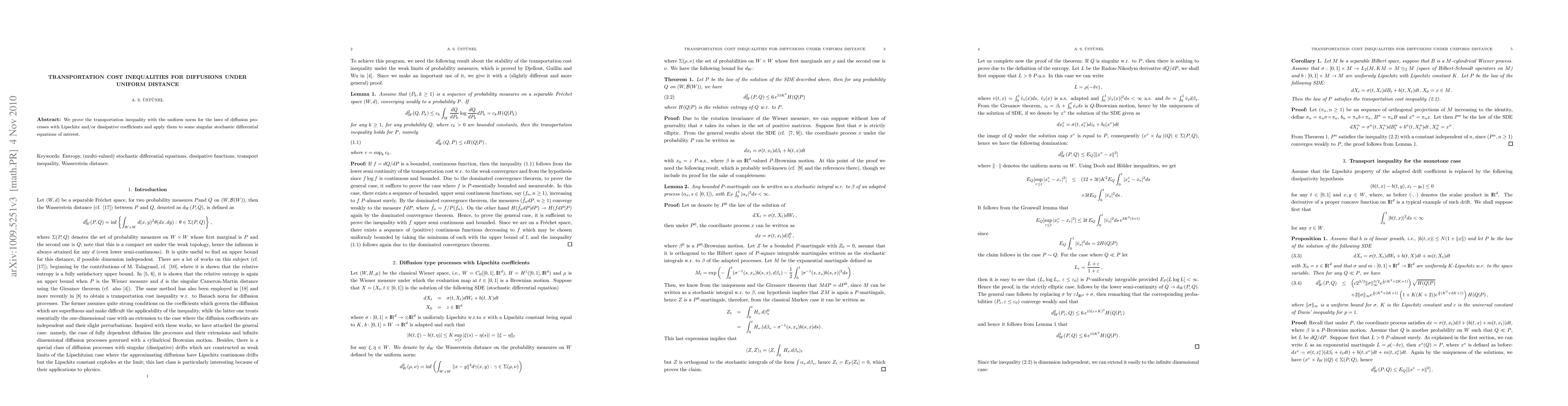 This research proves transportation inequalities for diffusion processes using uniform norm, applicable to Lipschitz and dissipative coefficient cases. It's utilized for analyzing specific singular stochastic differential equations.